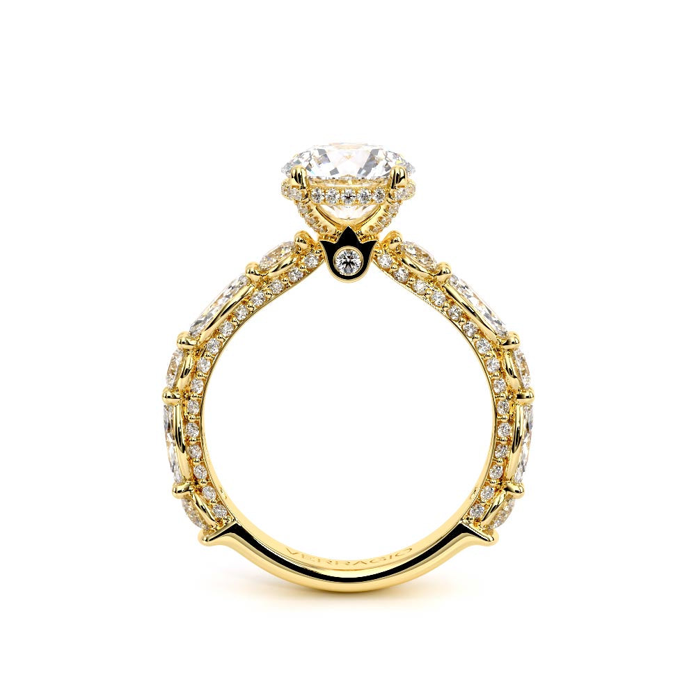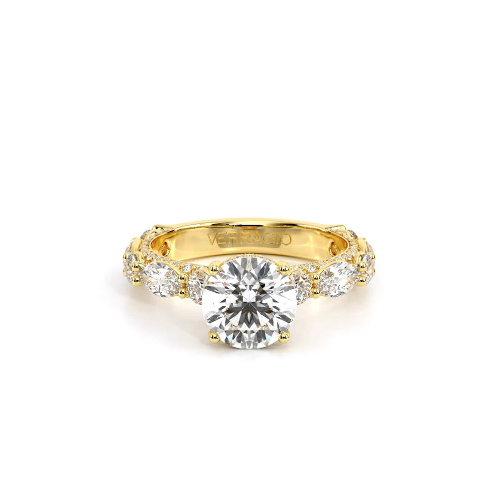 Couture-0490R-3.0 is an elevated four-prong engagement ring featuring a diamond-bridge head designed to highlight your center stone. Meticulously-set alternating round and marquise diamonds in a shared-prong setting wrap the elegant shank, enhanced with a pave-set three-quarter diamond riviera. The Verragio signature crest completes the statement look.