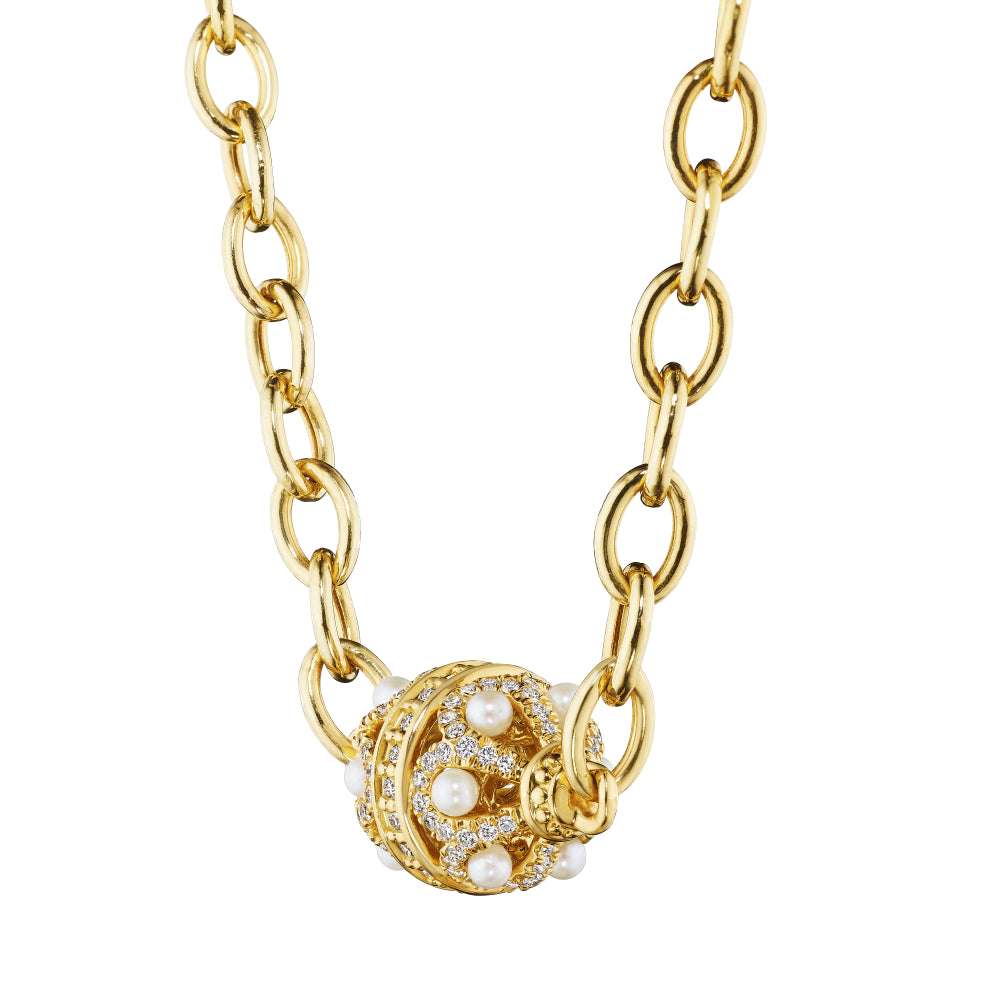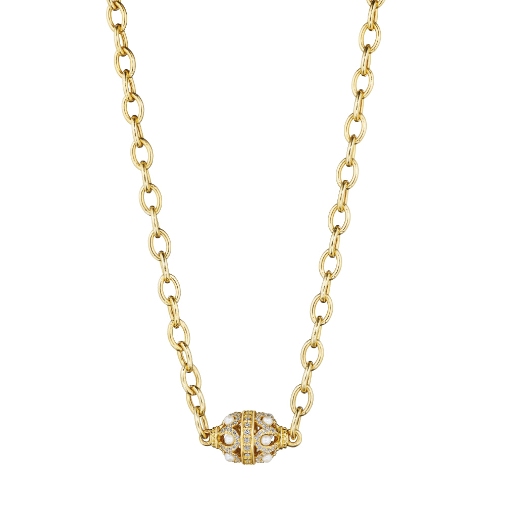 Adorn your neckline with the stunning Diamond and Pearl Rose Bead Necklace from the Devotion Collection. Fashioned in 18k yellow gold, it displays romantic diamonds and pearls in an engaging rose pattern, creating a warm, unique charm.