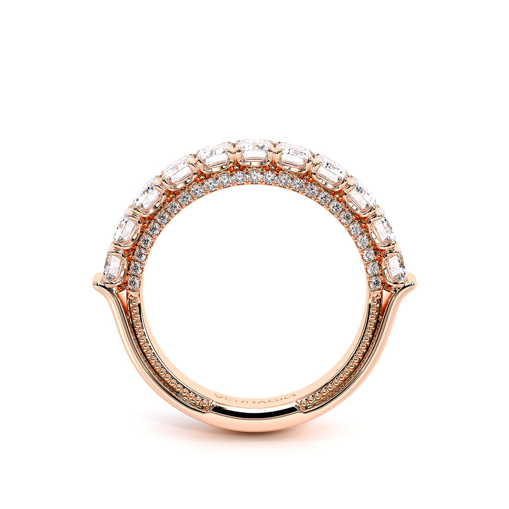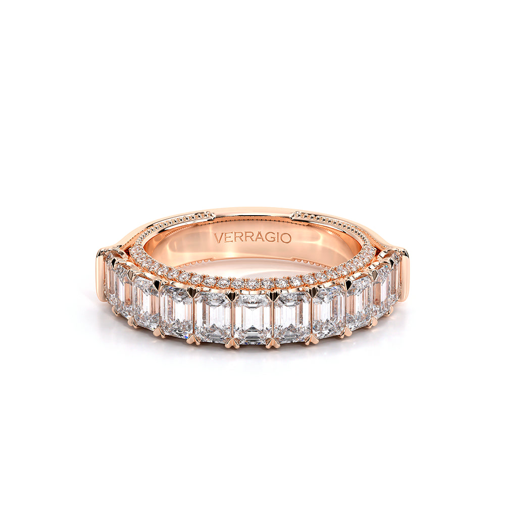 Eterna-2021-EM-4, Eternity band featuring Emerald cut diamonds going half way around. Our stunning half diamond riviera with round brilliant cut diamonds and signature beading completes this beauty.