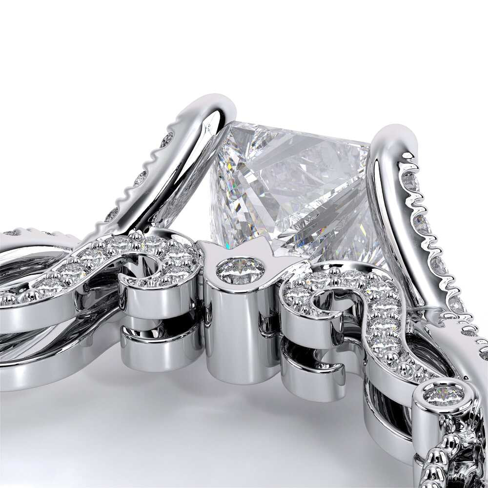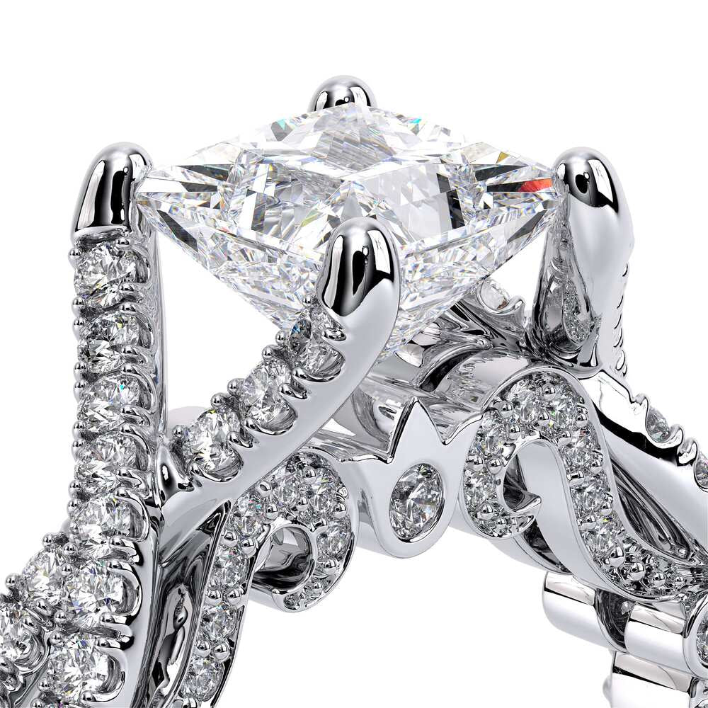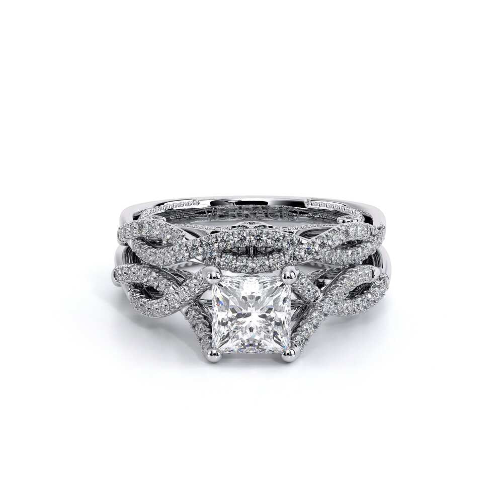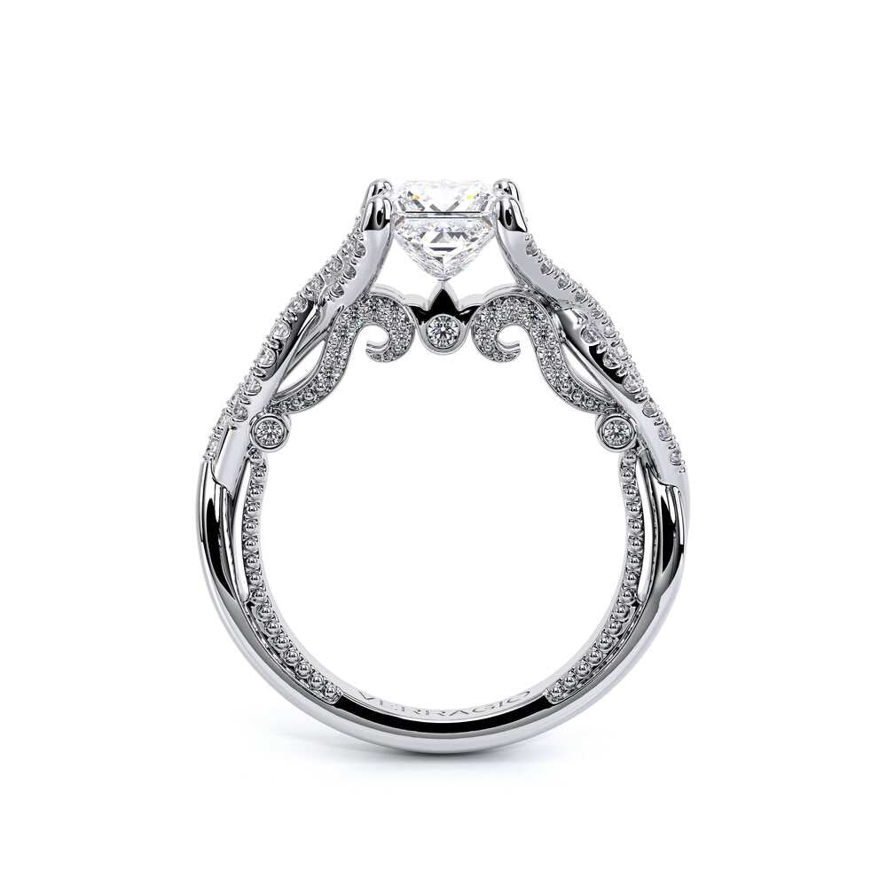 INSIGNIA-7060 Princess engagement ring, featuring round brilliant-cut pave set diamonds on a twisted band. Distinctively paired with Verragio's handcrafted signature beading and crest.