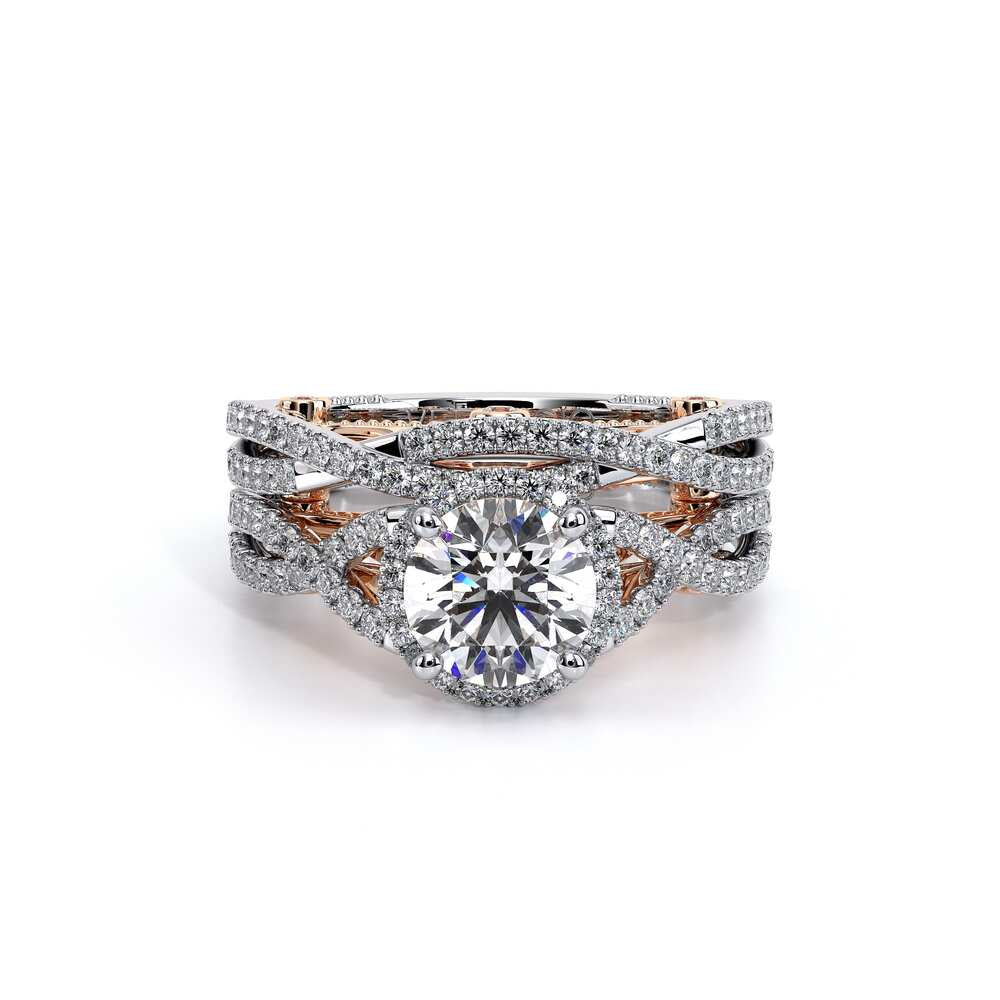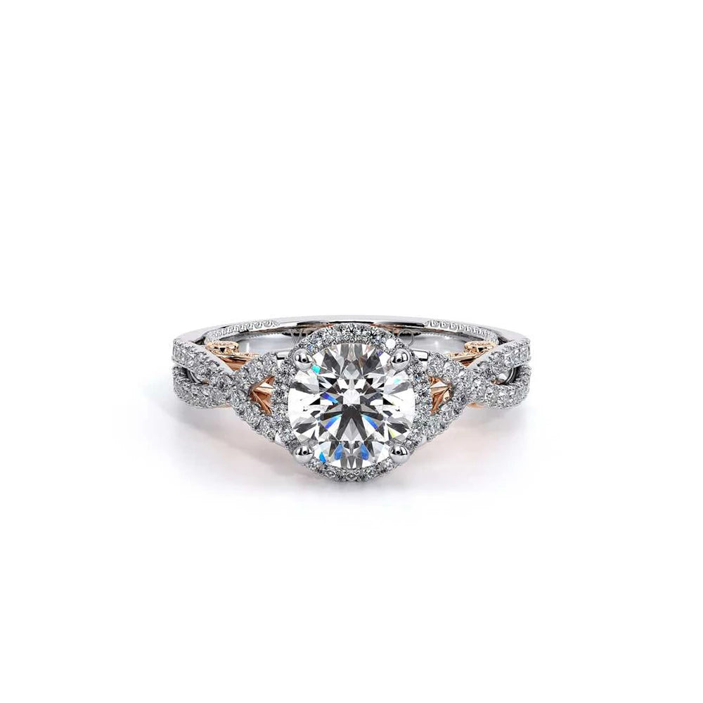 INSIGNIA-7070R Round halo engagement ring. Featuring, timeless pave' set round brilliant-cut diamonds on a twisted shank accompanied by Verragio's signature beading.