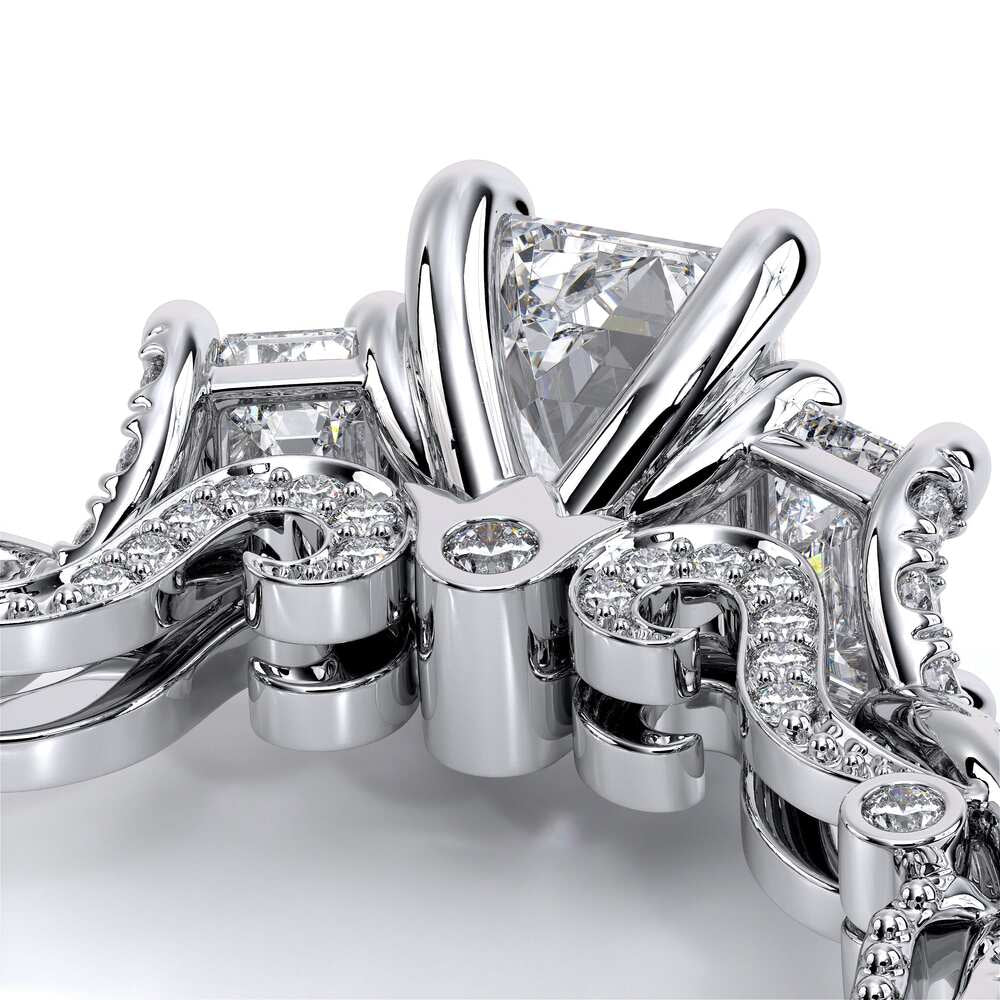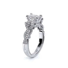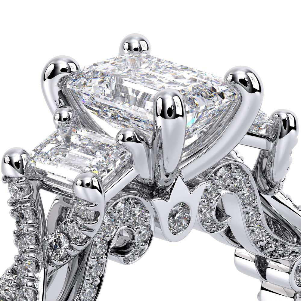 INSIGNIA-7074EM Three stone diamond engagement ring adorned with Verragio's signature beading, pave set brilliant-cut diamonds on Insignia's handcrafted scrollwork and twisted band. Refined to enhance a Emerald diamond center.