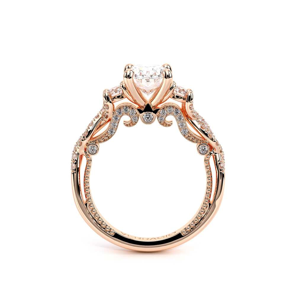 INSIGNIA-7074OV Three stone diamond engagement ring adorned with Verragio's signature beading, pave set brilliant-cut diamonds on Insignia's handcrafted scrollwork and twisted band. Refined to enhance a Oval diamond center.