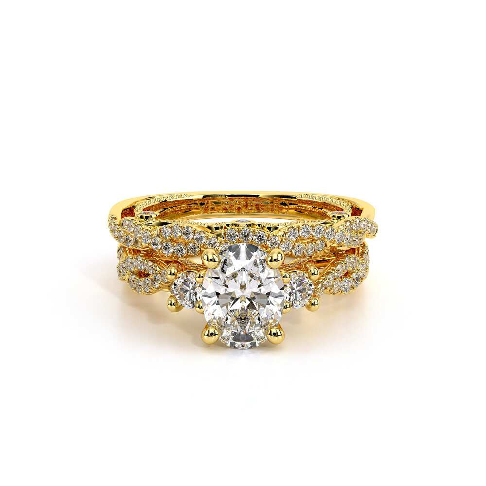 INSIGNIA-7074OV Three stone diamond engagement ring adorned with Verragio's signature beading, pave set brilliant-cut diamonds on Insignia's handcrafted scrollwork and twisted band. Refined to enhance a Oval diamond center.