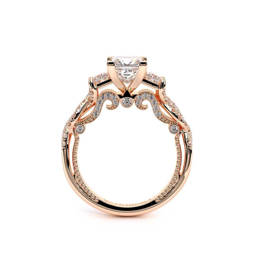 INSIGNIA-7074P Three stone diamond engagement ring adorned with Verragio's signature beading, pave set brilliant-cut diamonds on Insignia's handcrafted scrollwork and twisted band. Refined to enhance a Princess diamond center.