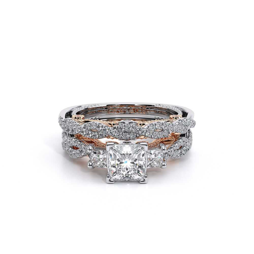 INSIGNIA-7074P Three stone diamond engagement ring adorned with Verragio's signature beading, pave set brilliant-cut diamonds on Insignia's handcrafted scrollwork and twisted band. Refined to enhance a Princess diamond center.