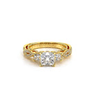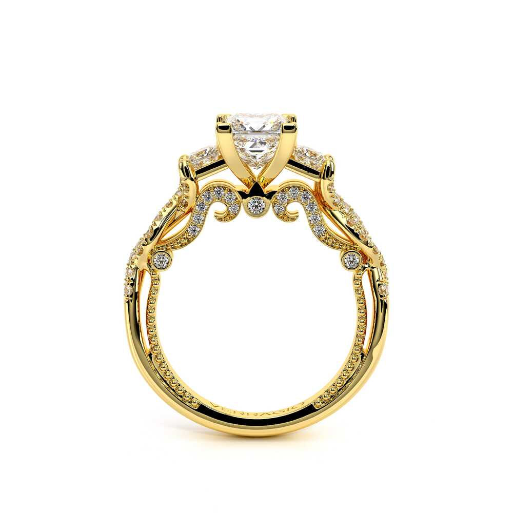 INSIGNIA-7074P Three stone diamond engagement ring adorned with Verragio's signature beading, pave set brilliant-cut diamonds on Insignia's handcrafted scrollwork and twisted band. Refined to enhance a Princess diamond center.