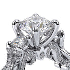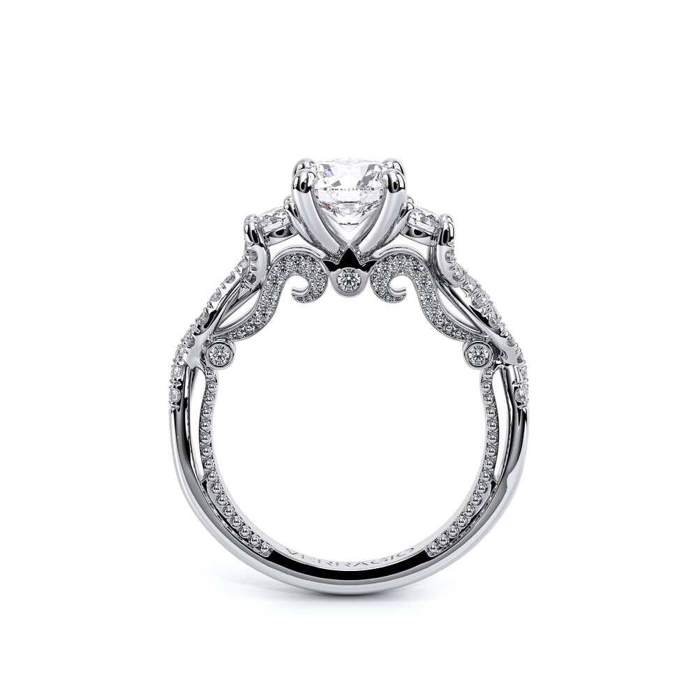 INSIGNIA-7074R Three stone diamond engagement ring adorned with Verragio's signature beading, pave set brilliant-cut diamonds on Insignia's handcrafted scrollwork and twisted band. Refined to enhance a Round diamond center.