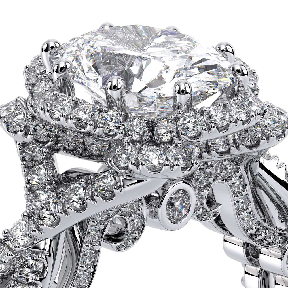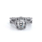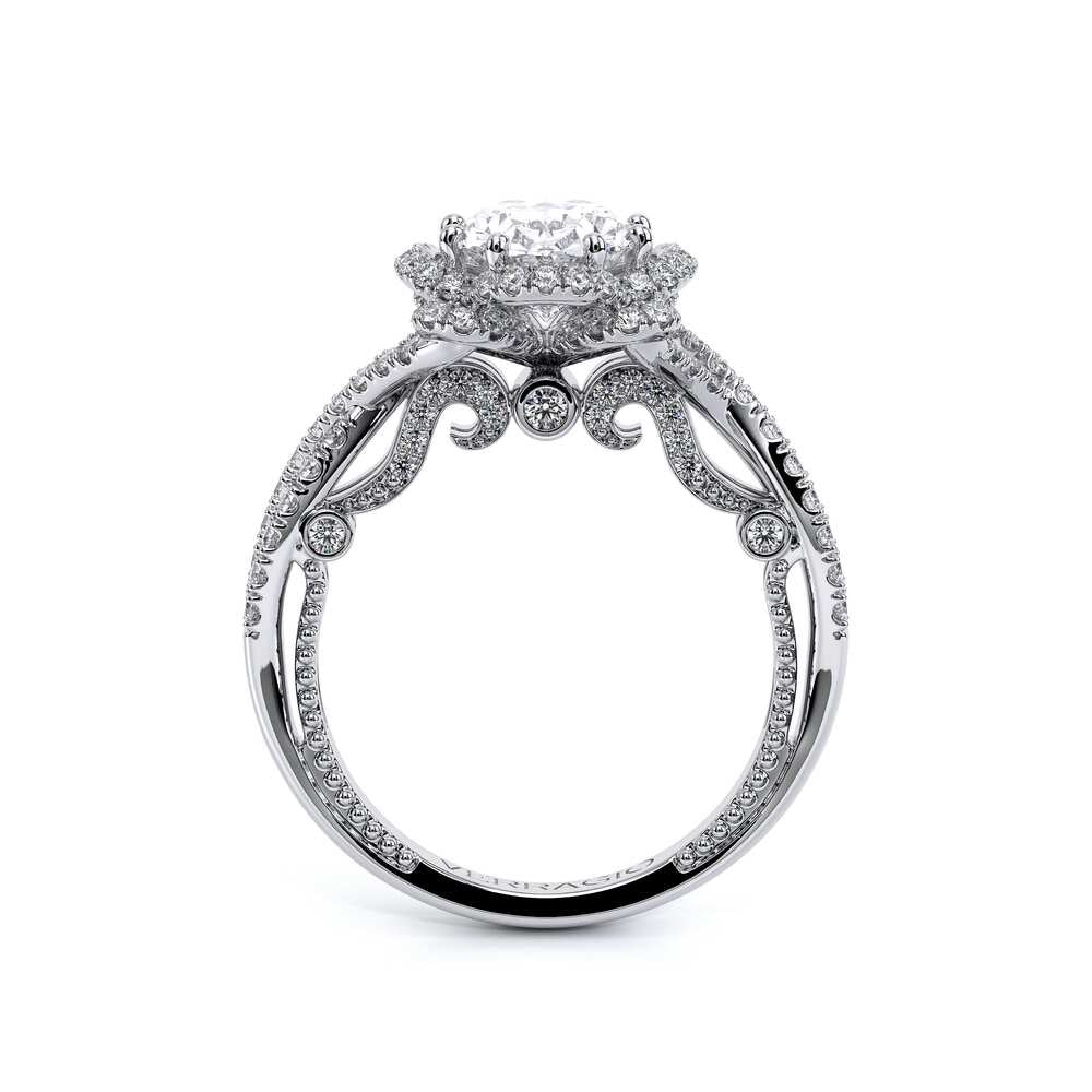 INSIGNIA-7087OV Featuring, Verragio's uniquely designed handcrafted floret halo that is adorned with meticulously set round pave brilliant-cut diamonds on a twisted band. Encompassed by Insignia's handcrafted diamond scrollwork and Verragio's signature beading to enhance a Oval diamond center.