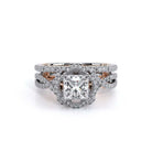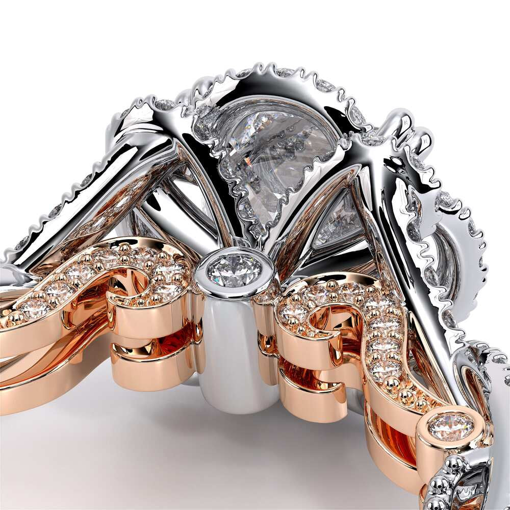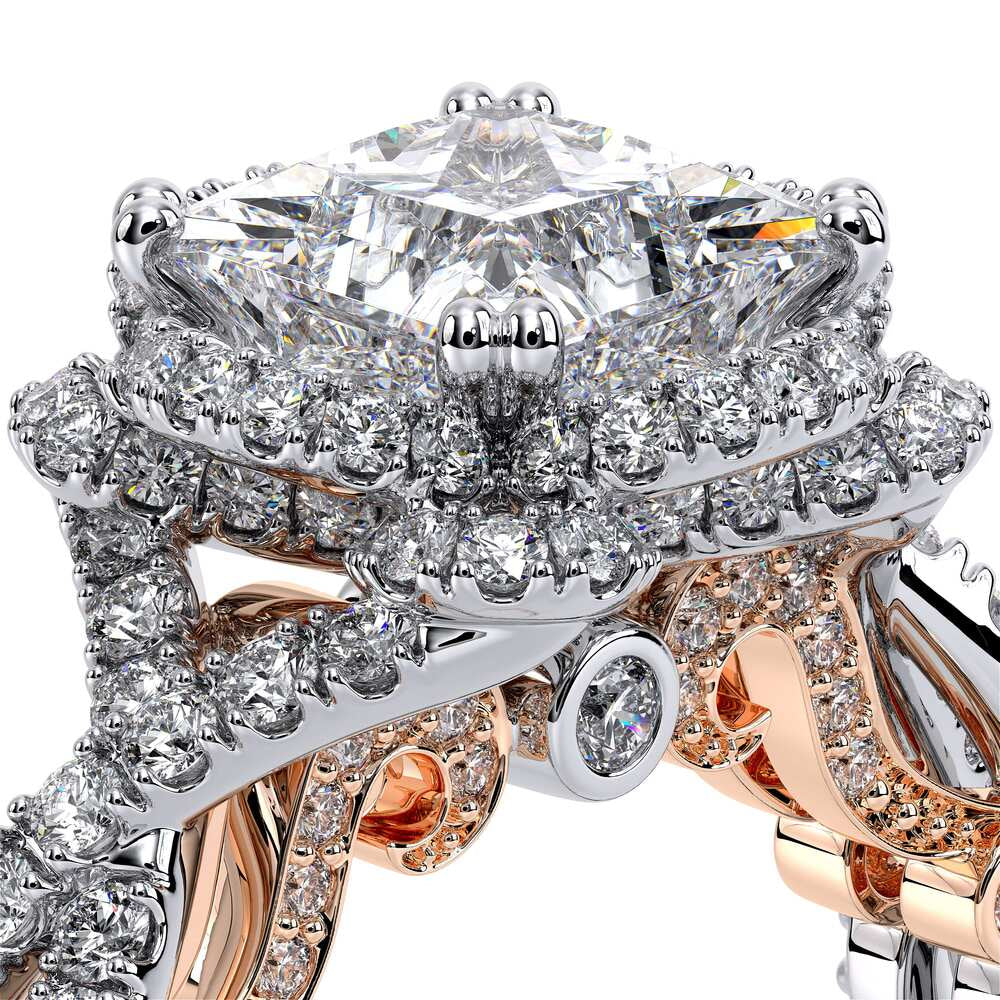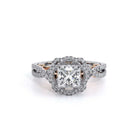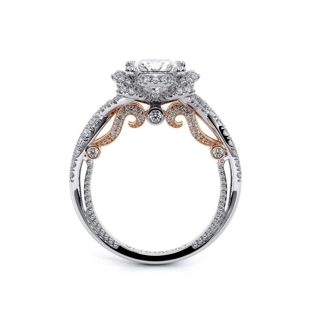 INSIGNIA-7087P Featuring, Verragio's uniquely designed handcrafted floret halo that is adorned with meticulously set round pave brilliant-cut diamonds on a twisted band. Encompassed by Insignia's handcrafted diamond scrollwork and Verragio's signature beading to enhance a Princess diamond center.