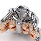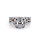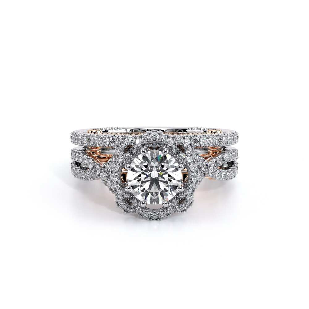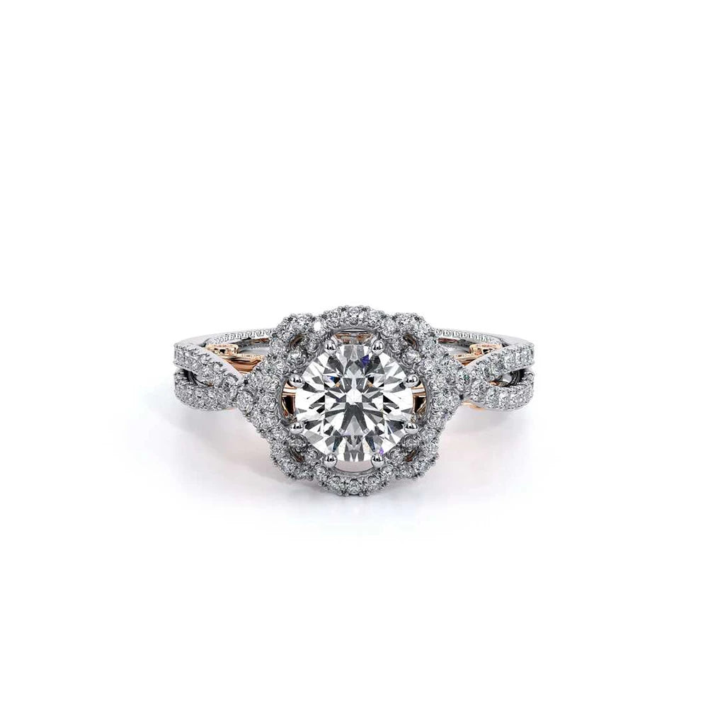 INSIGNIA-7087R Featuring, Verragio's uniquely designed handcrafted floret halo that is adorned with meticulously set round pave brilliant-cut diamonds on a twisted band. Encompassed by Insignia's handcrafted diamond scrollwork and Verragio's signature beading to enhance a Round diamond center.