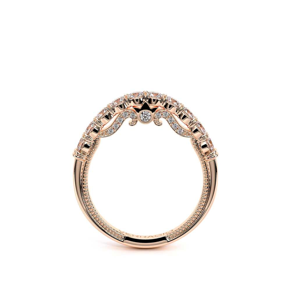 INSIGNIA-7100W diamond wedding ring from the Insignia Collection, featuring a shared-prong set band with round brilliant-cut diamonds. Distinguished by handcrafted diamond Insignia scrollwork amid Verragio's signature beading and crest.