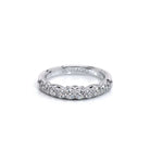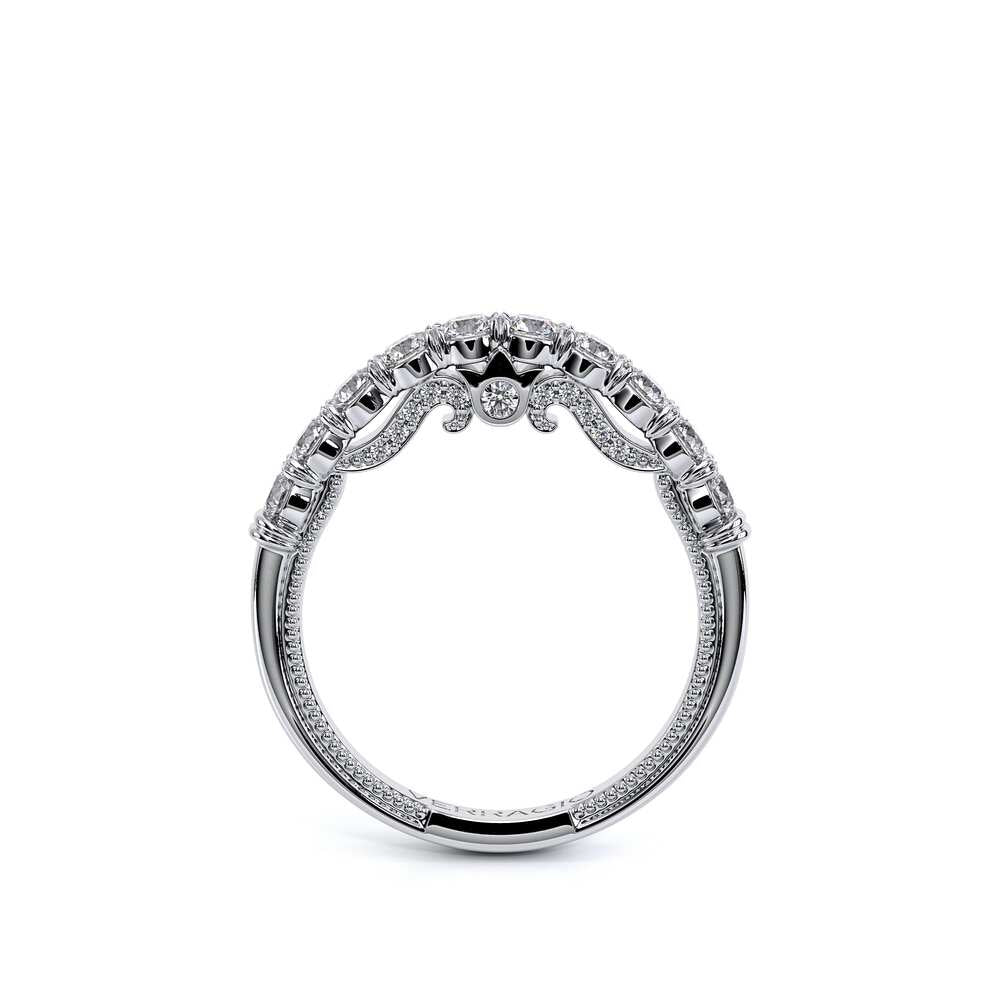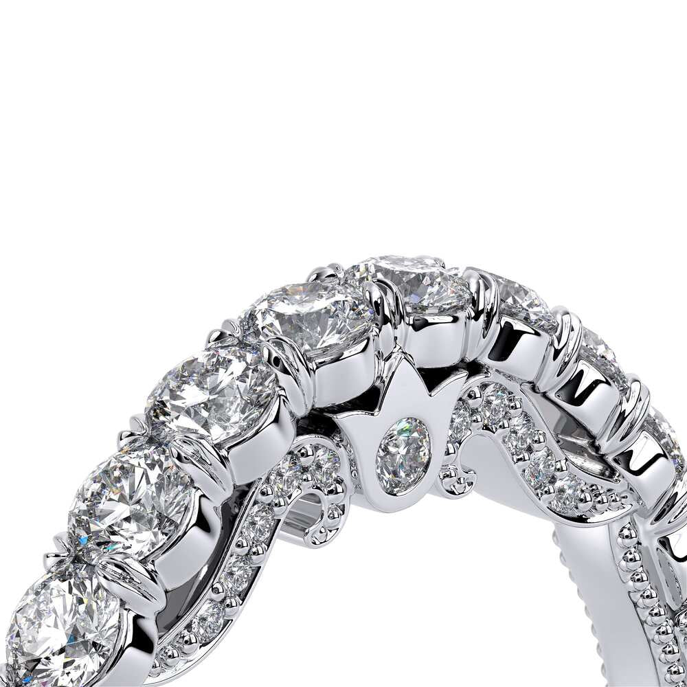INSIGNIA-7100W diamond wedding ring from the Insignia Collection, featuring a shared-prong set band with round brilliant-cut diamonds. Distinguished by handcrafted diamond Insignia scrollwork amid Verragio's signature beading and crest.