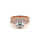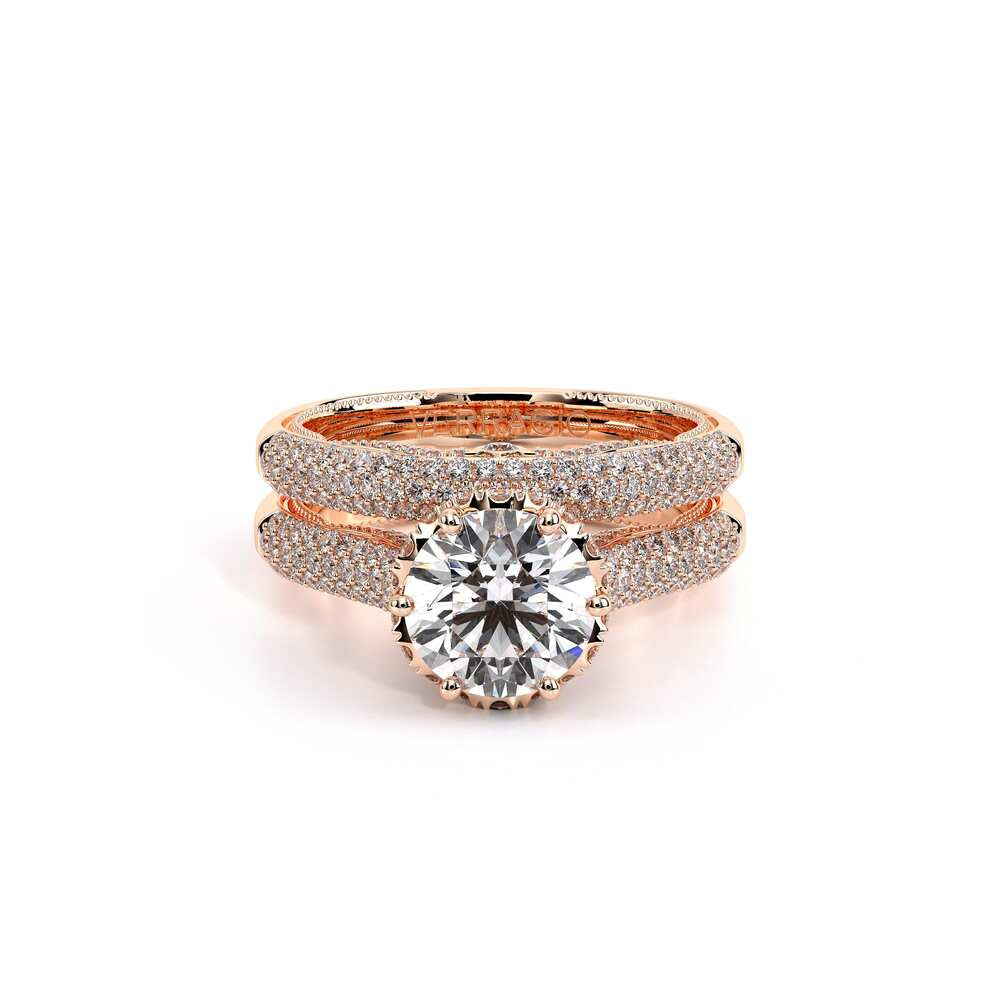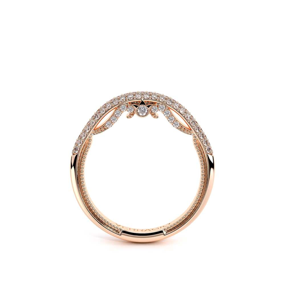 INSIGNIA-7104W diamond wedding ring from the Insignia Collection, featuring round brilliant-cut diamonds pave set on a straight band. Adorned with handcrafted diamond Insignia scrollwork accompanied by Verragio's signature crest and beading.