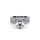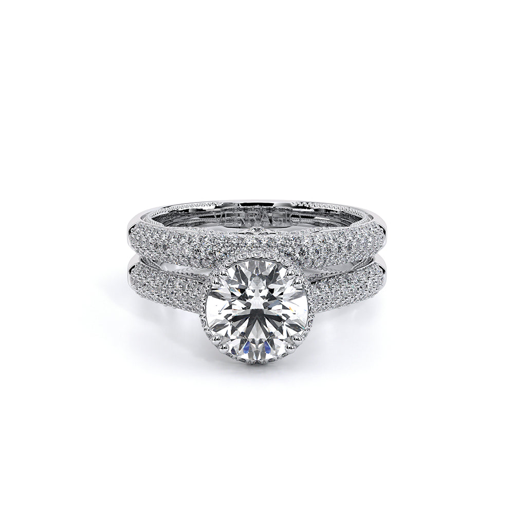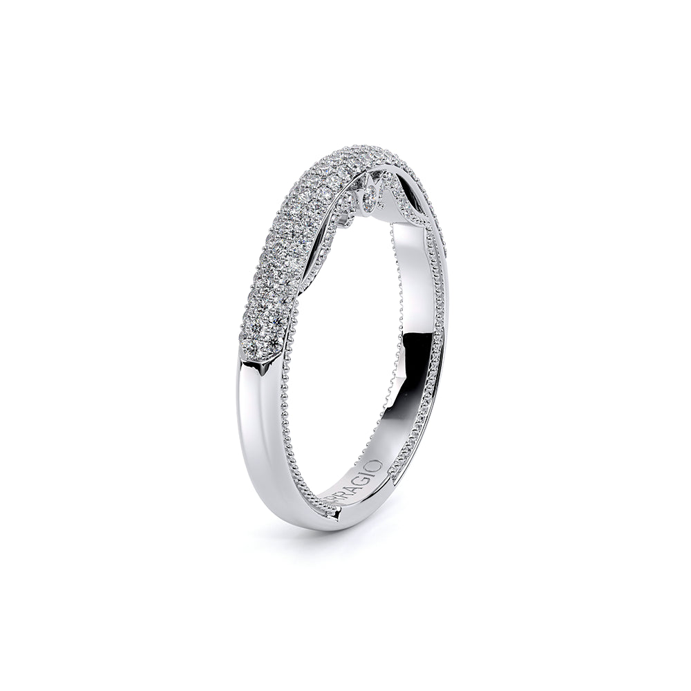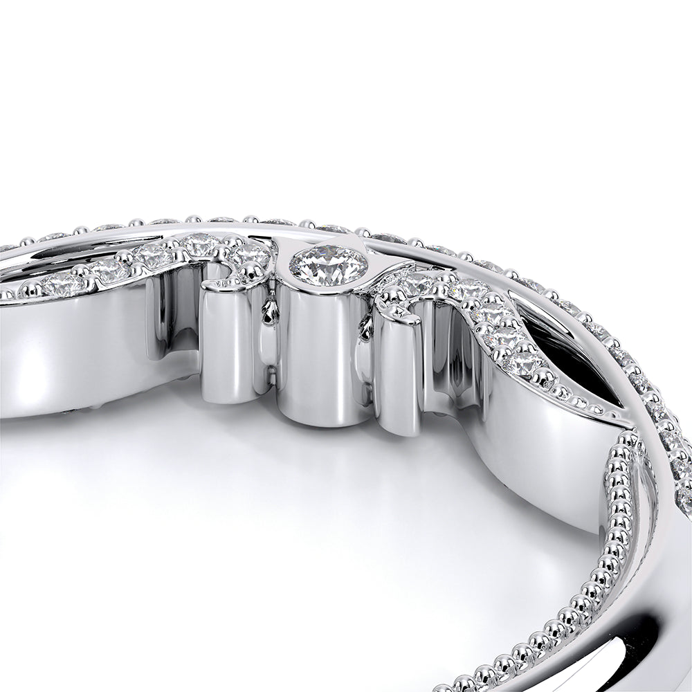 INSIGNIA- 7105W is a testament to timeless elegance, featuring two rows of meticulously set pave diamonds that gracefully encircle the band. Crafted with precision adorned with our signature Insignia scrollwork, Verragio crest, and beading.