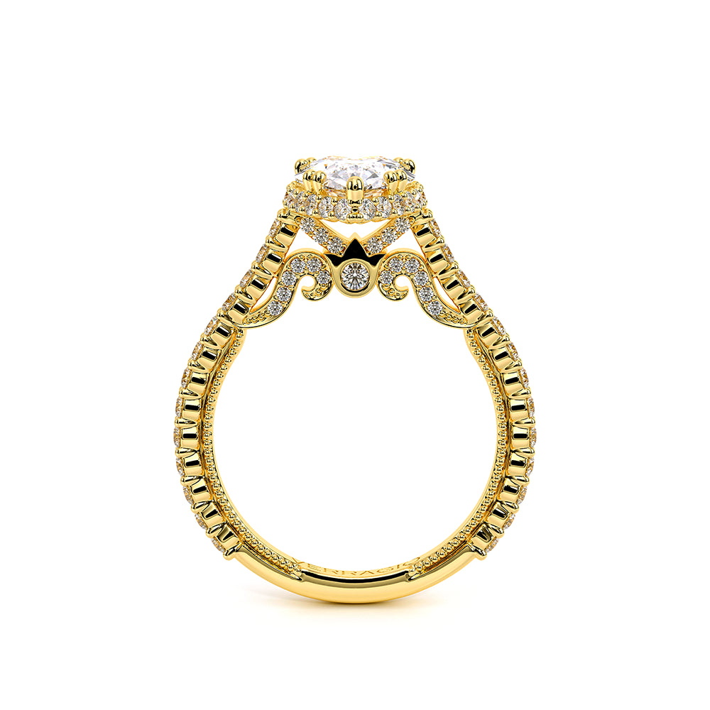 INSIGNIA-7109PS Oval engagement ring features Verragio' s handcrafted stardust halo. Meticulously-set round brilliant-cut diamonds sit atop a straight band. Refined by Verragio' s Insignia diamond scrollwork, timeless signature crest and beading.
