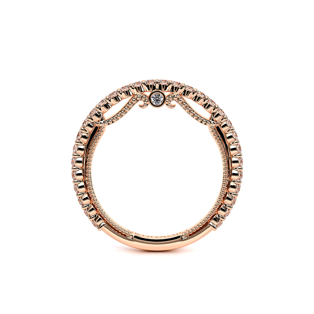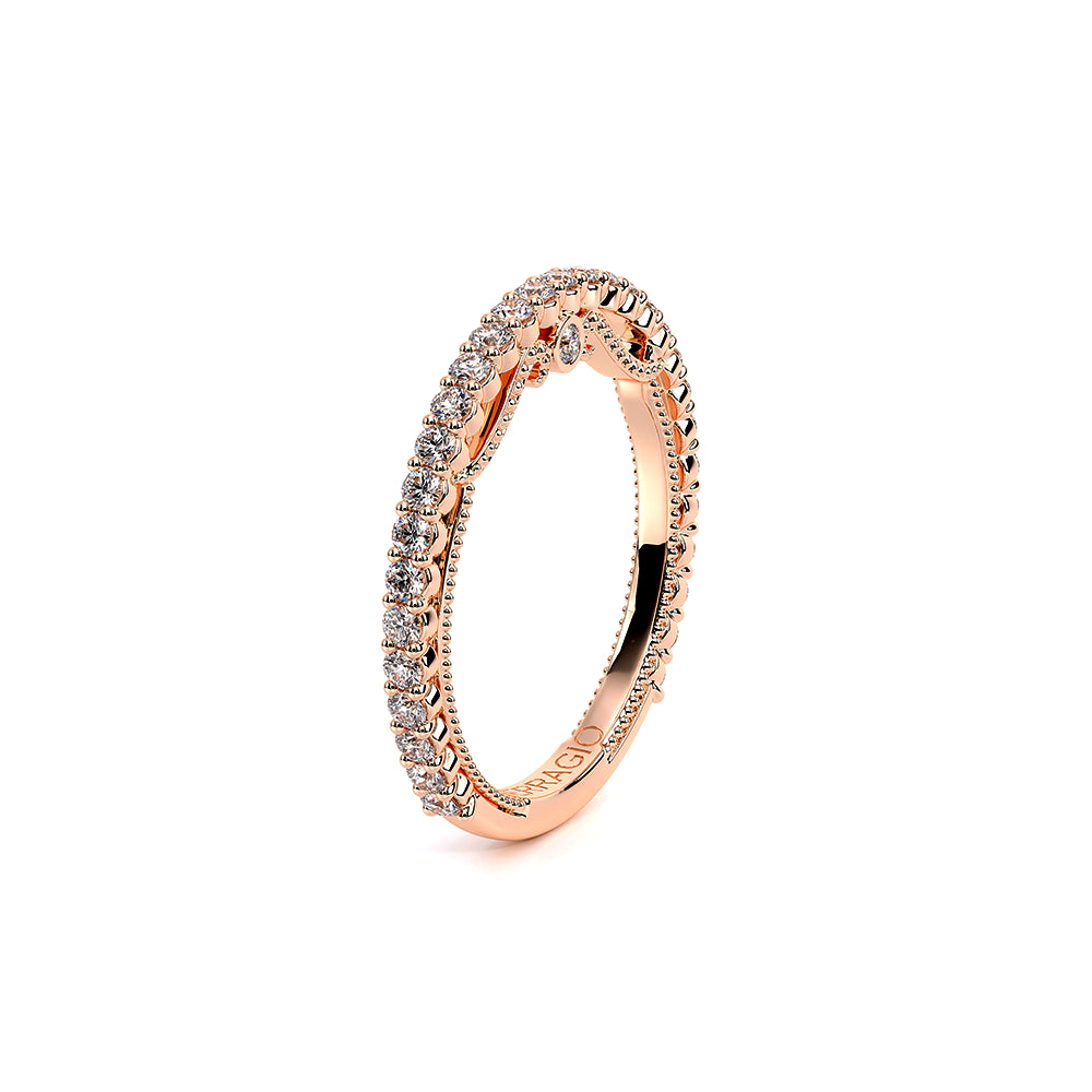 INSIGNIA-7109W diamond wedding ring from the Insignia Collection, featuring a shared-prong set band with round brilliant-cut diamonds. Distinguished by handcrafted Insignia scrollwork amid Verragio's signature beading and crest.