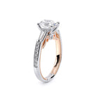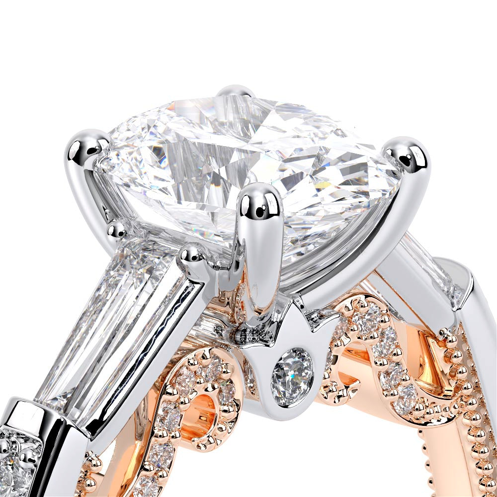 Insignia-7110OV is a enchanting three-stone engagement ring featuring baguette diamond side-stones. Atop a band embellished with round brilliant-cut diamonds, the ring showcases Insignia's bold diamond scrollwork, seamlessly uniting Verragio's iconic crest and signature beading.