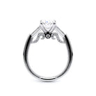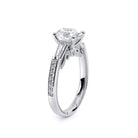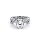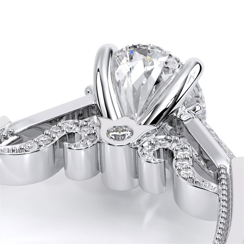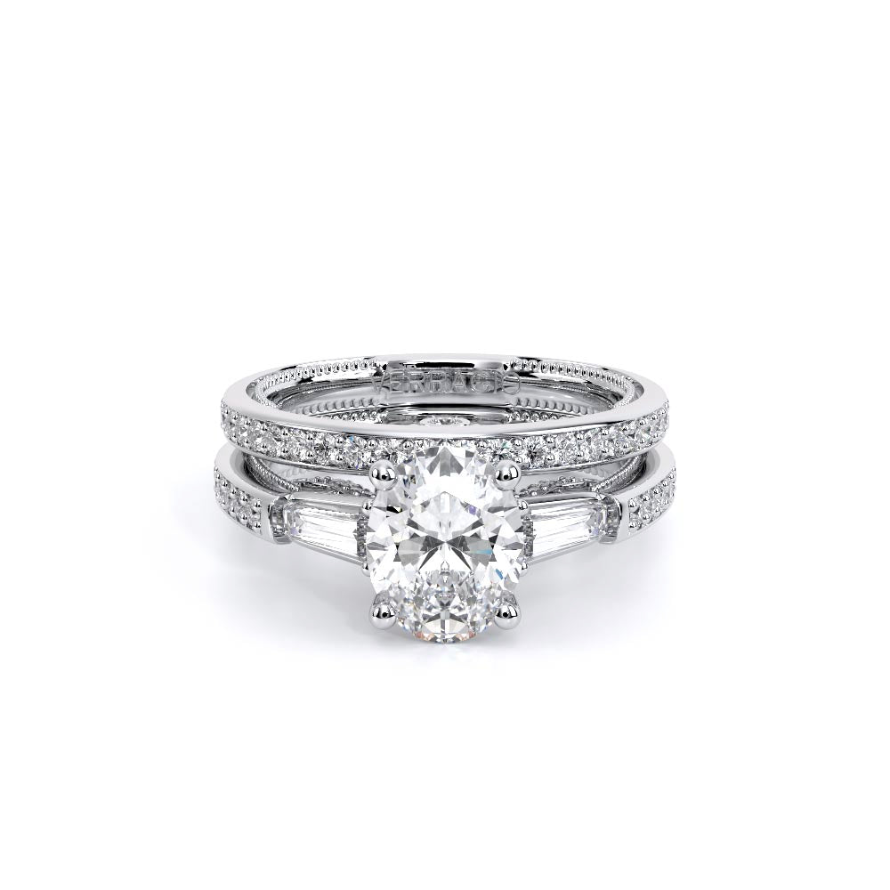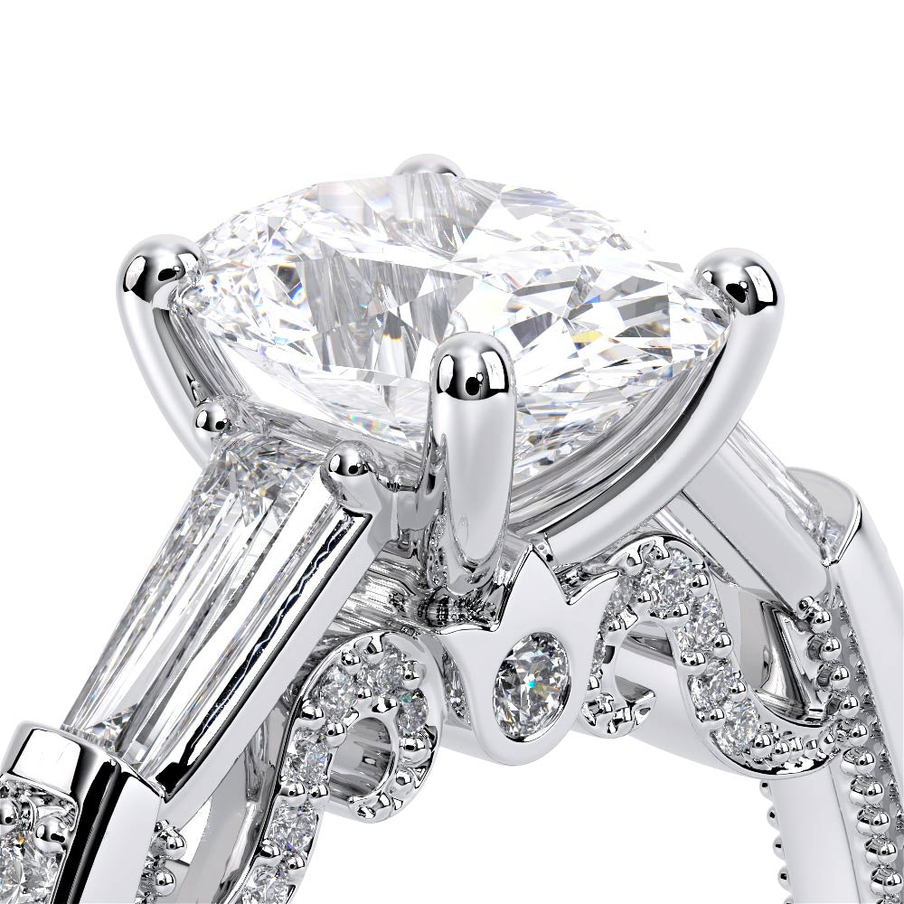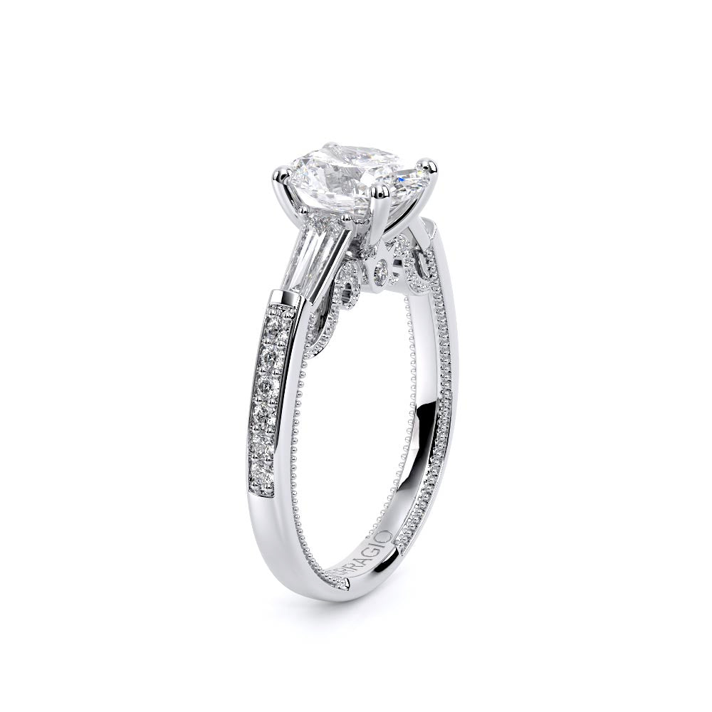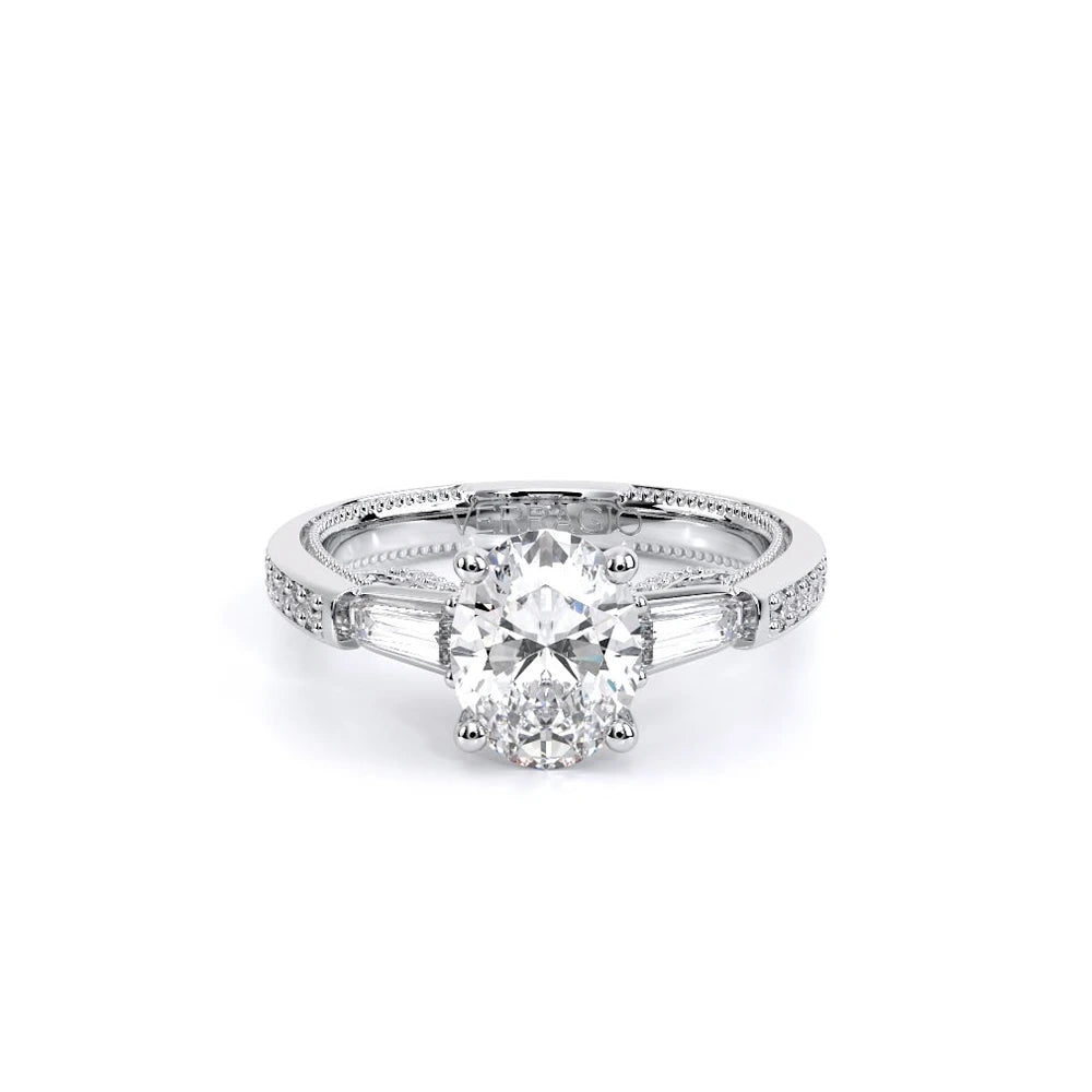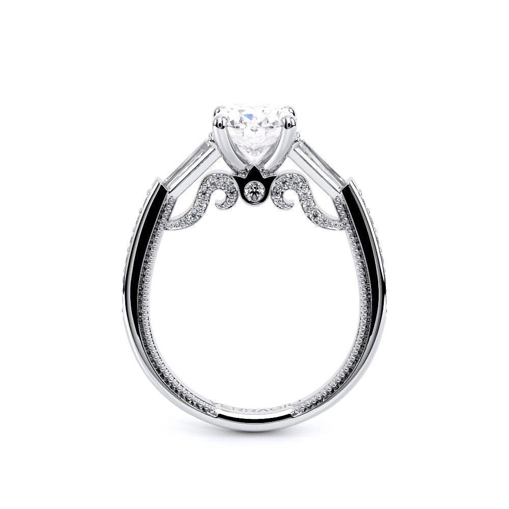 Insignia-7110OV is a enchanting three-stone engagement ring featuring baguette diamond side-stones. Atop a band embellished with round brilliant-cut diamonds, the ring showcases Insignia's bold diamond scrollwork, seamlessly uniting Verragio's iconic crest and signature beading.