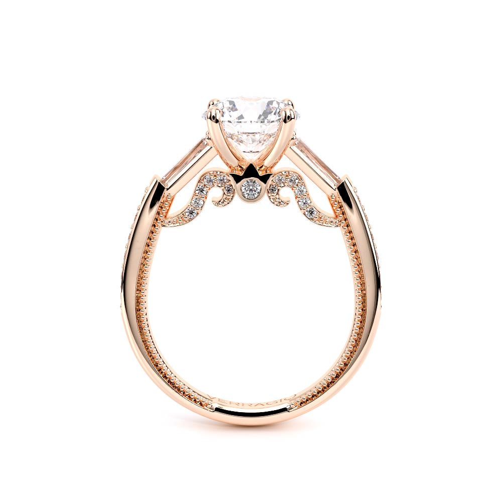 Insignia-7110R is a enchanting three-stone engagement ring featuring baguette diamond side-stones. Atop a band embellished with round brilliant-cut diamonds, the ring showcases Insignia's bold diamond scrollwork, seamlessly uniting Verragio's iconic crest and signature beading.