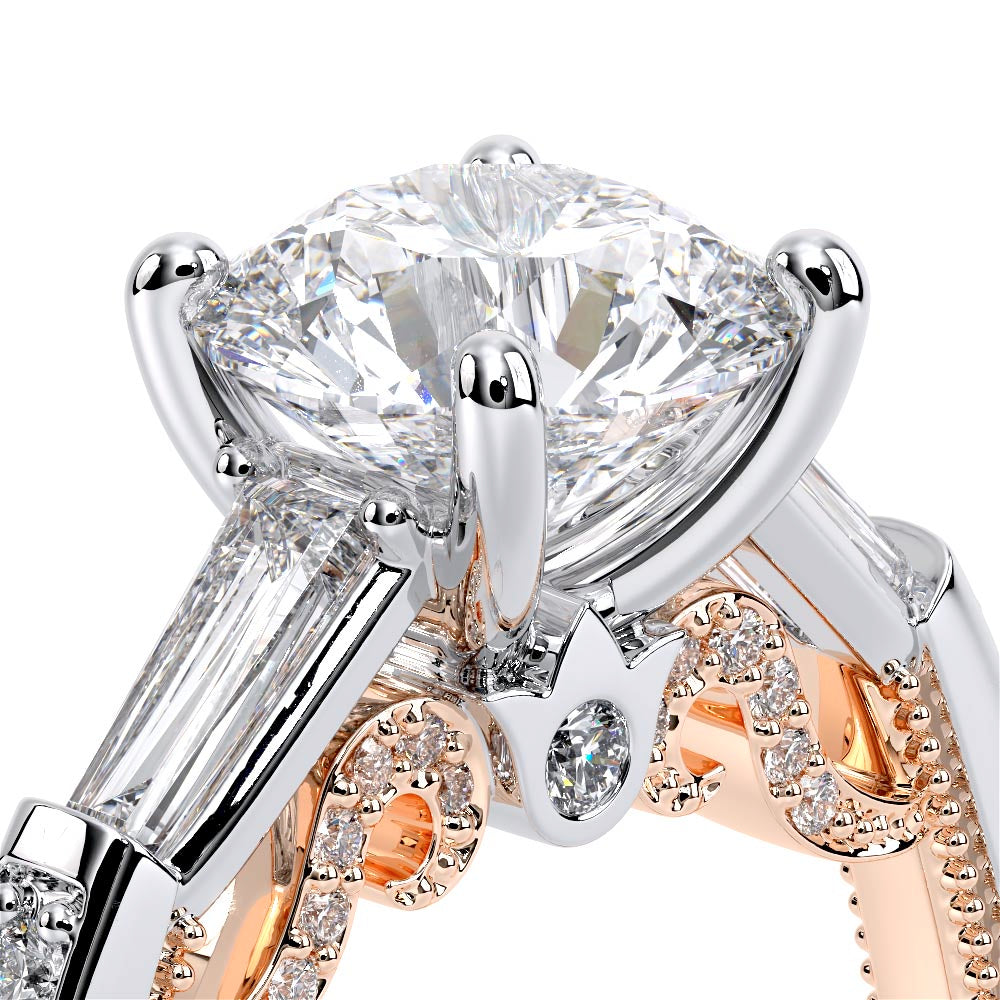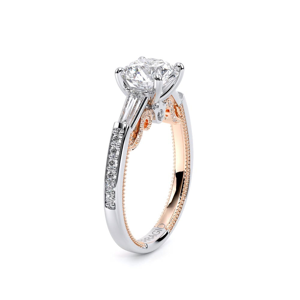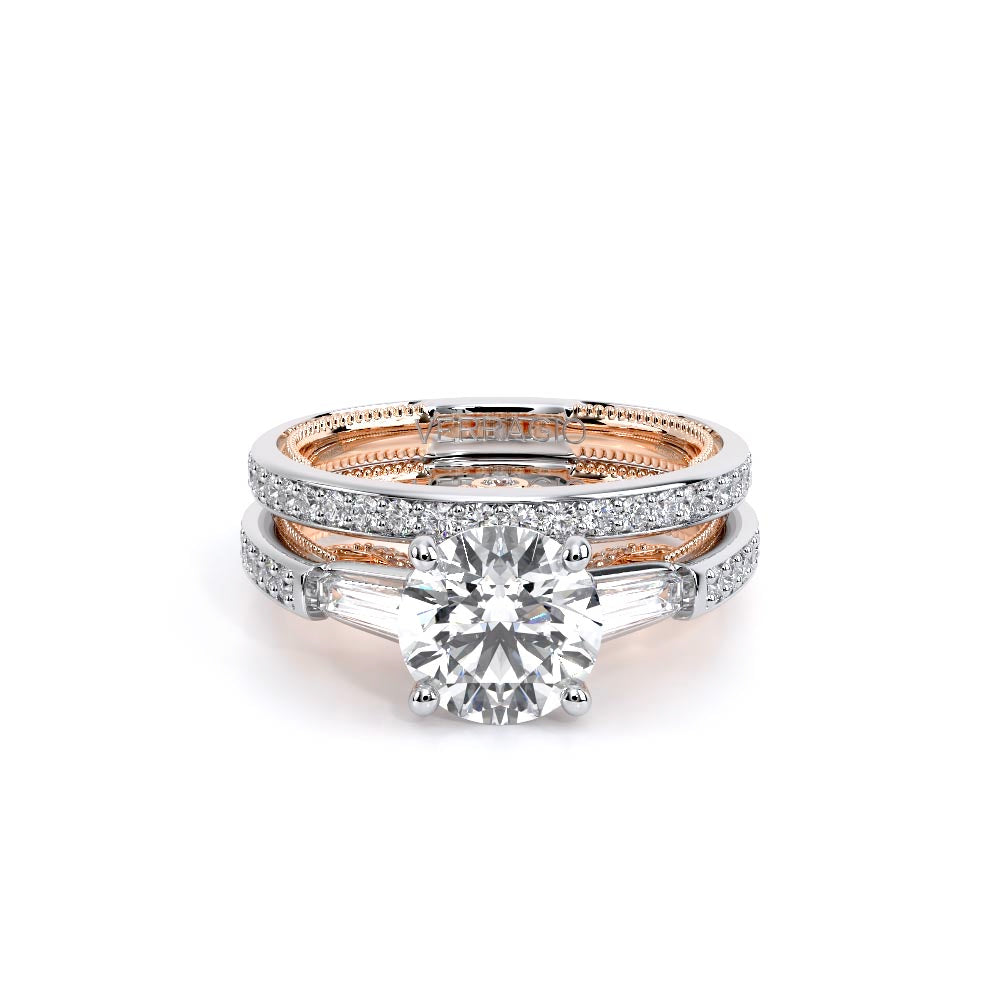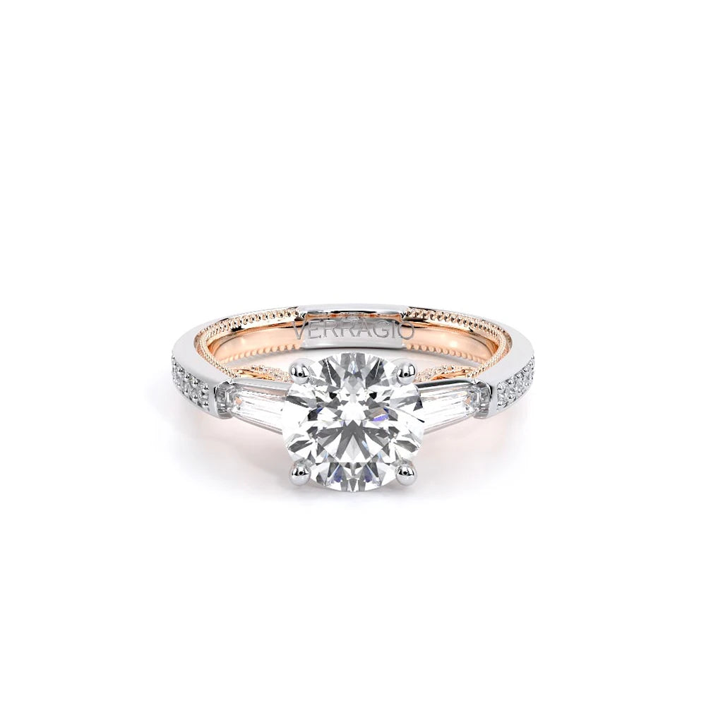 Insignia-7110R is a enchanting three-stone engagement ring featuring baguette diamond side-stones. Atop a band embellished with round brilliant-cut diamonds, the ring showcases Insignia's bold diamond scrollwork, seamlessly uniting Verragio's iconic crest and signature beading.