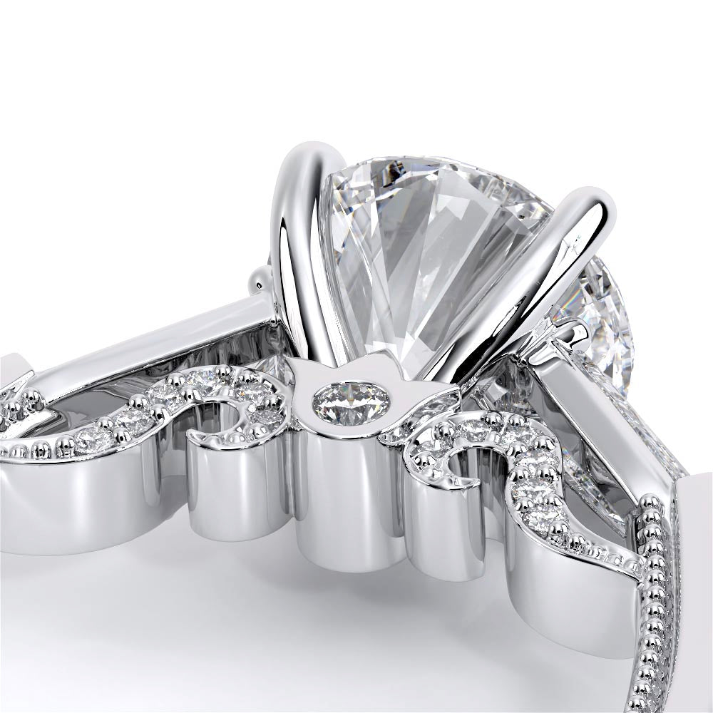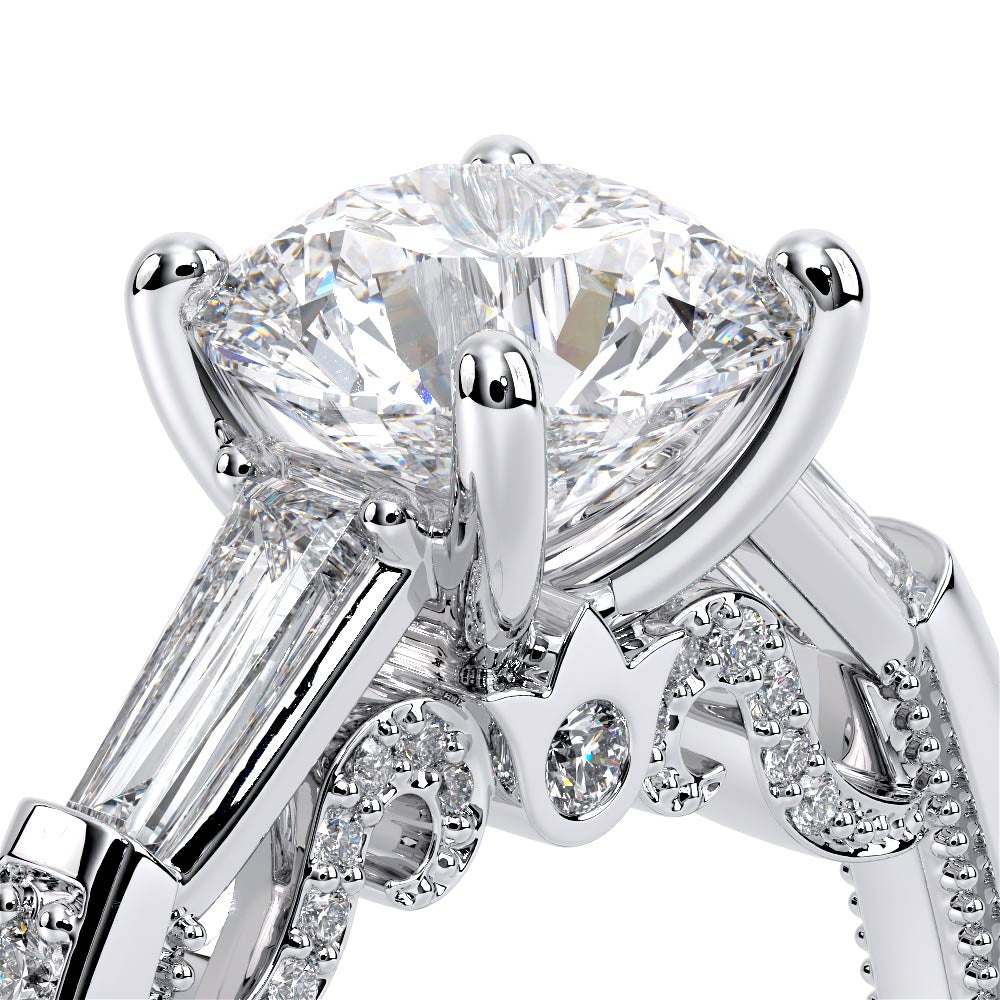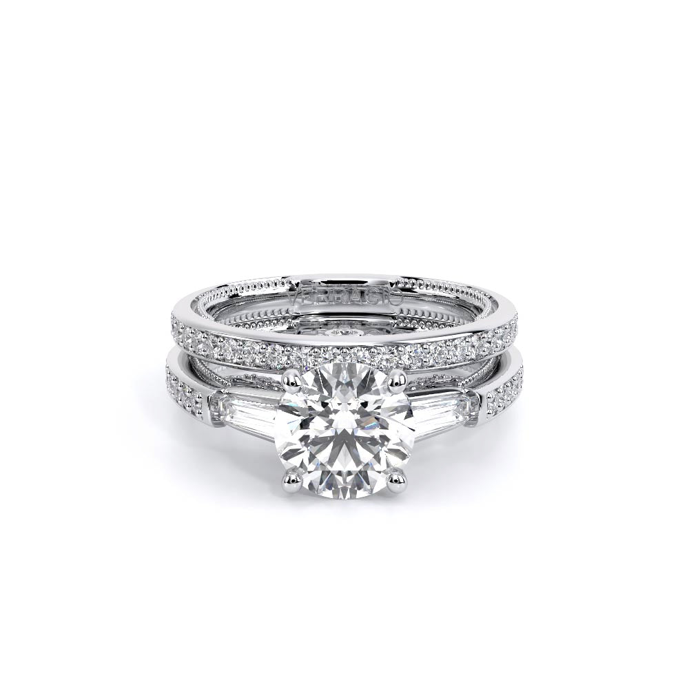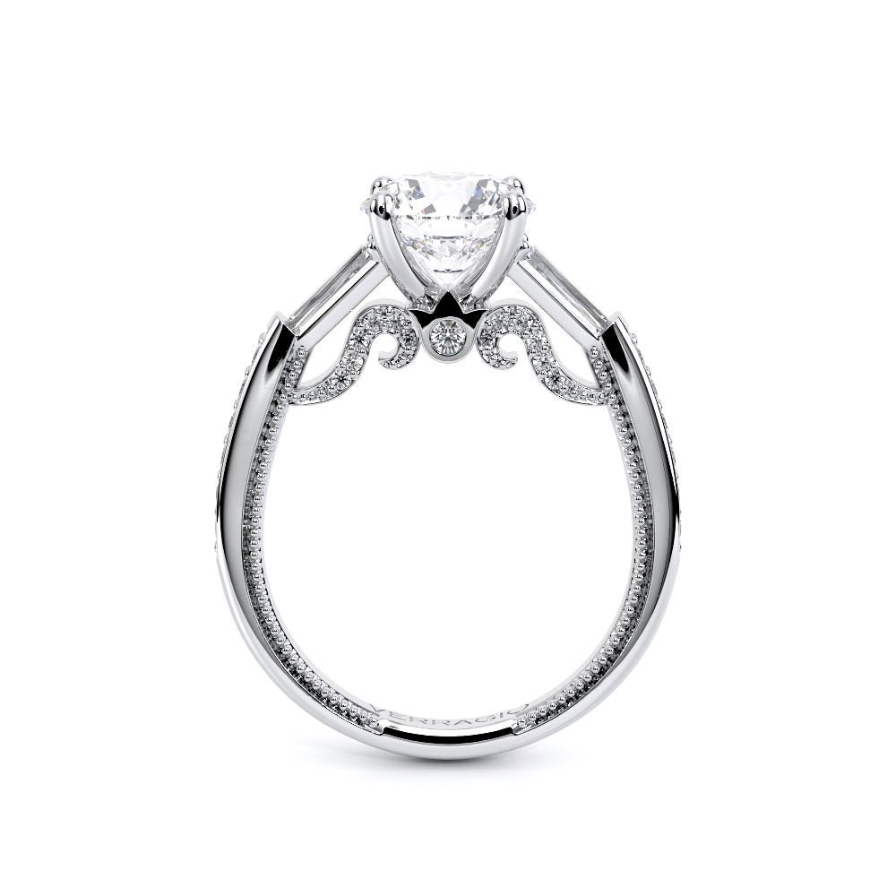 Insignia-7110R is a enchanting three-stone engagement ring featuring baguette diamond side-stones. Atop a band embellished with round brilliant-cut diamonds, the ring showcases Insignia's bold diamond scrollwork, seamlessly uniting Verragio's iconic crest and signature beading.
