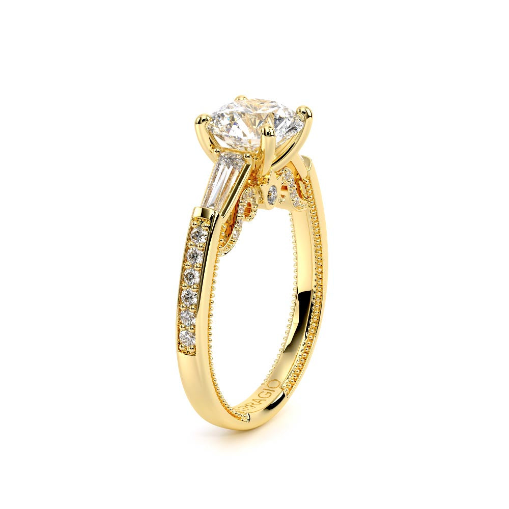 Insignia-7110R is a enchanting three-stone engagement ring featuring baguette diamond side-stones. Atop a band embellished with round brilliant-cut diamonds, the ring showcases Insignia's bold diamond scrollwork, seamlessly uniting Verragio's iconic crest and signature beading.