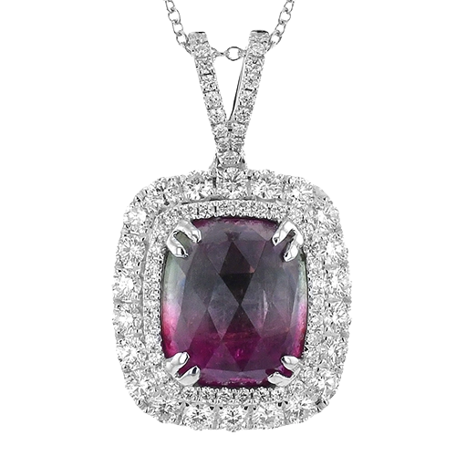 This lovely pendant features a rectangular opaque 9.40 ct paraiba tourmaline center stone, surrounded by a double halo- the inner halo has .43 ctw of white diamonds, and the outer halo contains 1.85 ctw of blue sapphires.