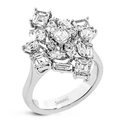 This incredible 18k white gold ring certainly makes a statement with diamonds in round, baguette, asscher, and pear shapes all combined in a geometric setting.