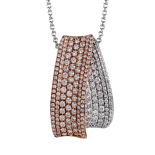 Combining both rose and white 18k gold, this stunning pendant features an overlapping design which is set with 1.55 ctw of round white diamonds.