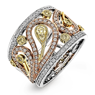 This vintage inspired tri-tone band features a delicate floral design accented by .55 ctw round cut white diamonds and .20 ctw round cut yellow diamonds set in lovely rose, yellow, and white gold.