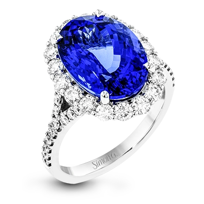 This dazzling vintage-inspired ring in white gold features a gorgeous 7.01 ctw tanzanite framed by 1.16 ctw of round white diamonds in a beautiful halo and split-shank design.