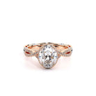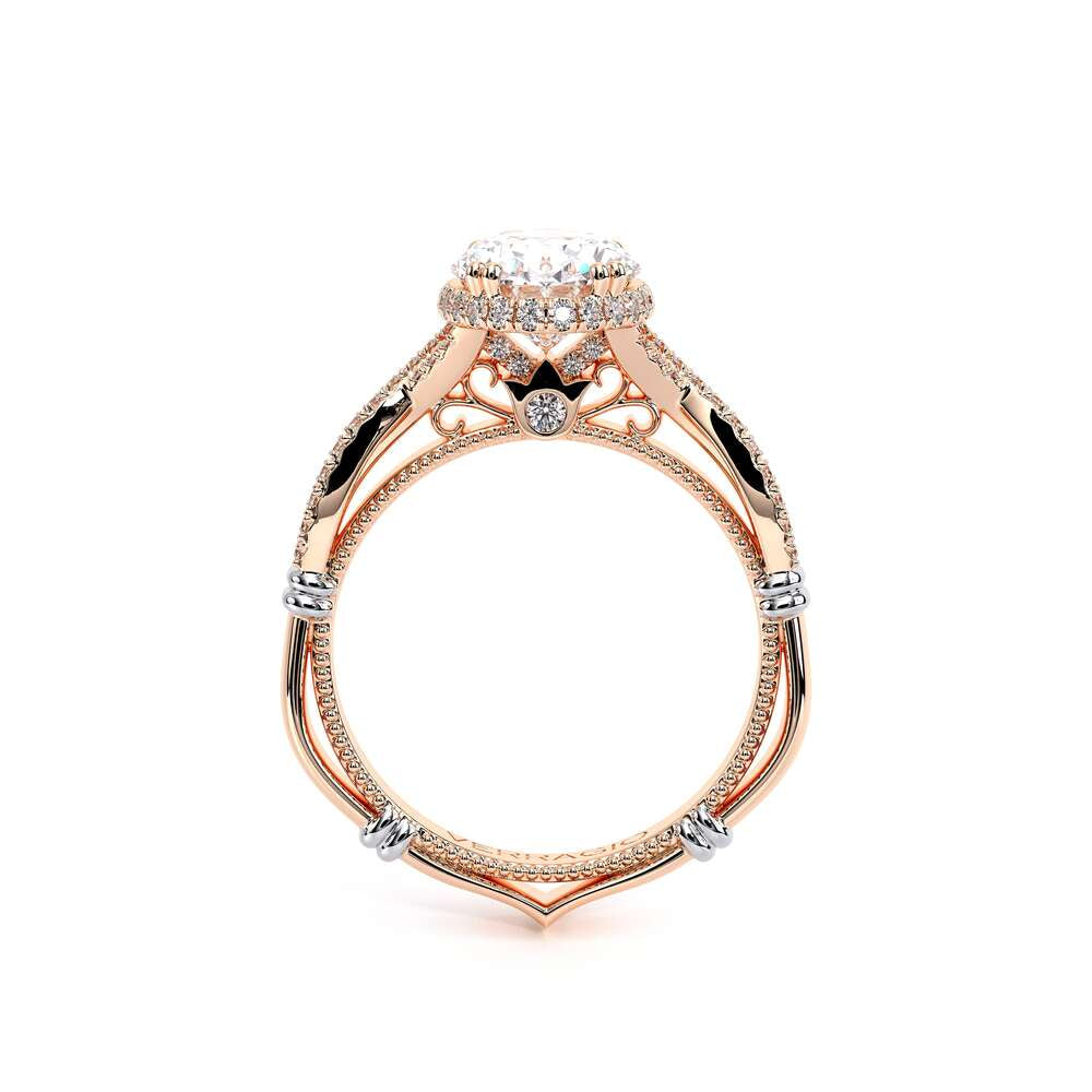 Parisian-105-XOV is a classic engagement ring that features pave set twisted diamond band showcasing our brand new Stardust Oval halo. The details continue to flow with the addition of Parisian Lace, our Verragio signature beading and lastly the rose gold Timeless wraps.
