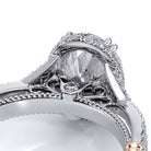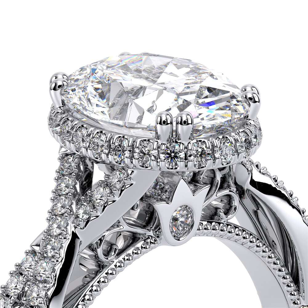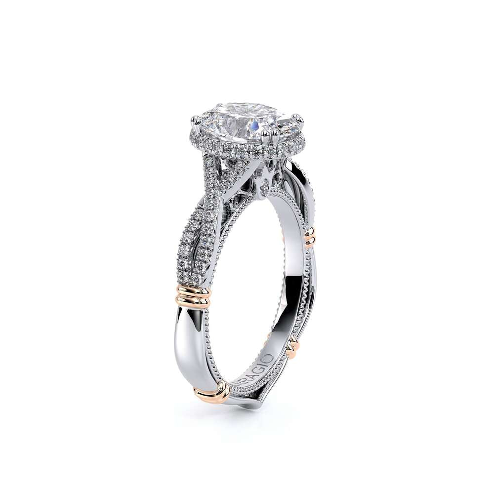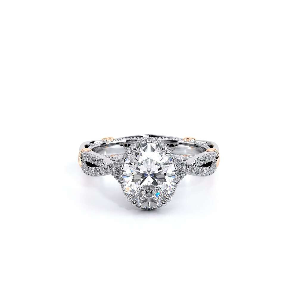 Parisian-105-XOV is a classic engagement ring that features pave set twisted diamond band showcasing our brand new Stardust Oval halo. The details continue to flow with the addition of Parisian Lace, our Verragio signature beading and lastly the rose gold Timeless wraps.