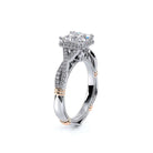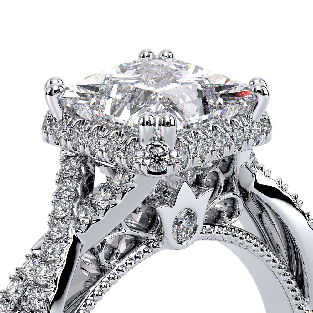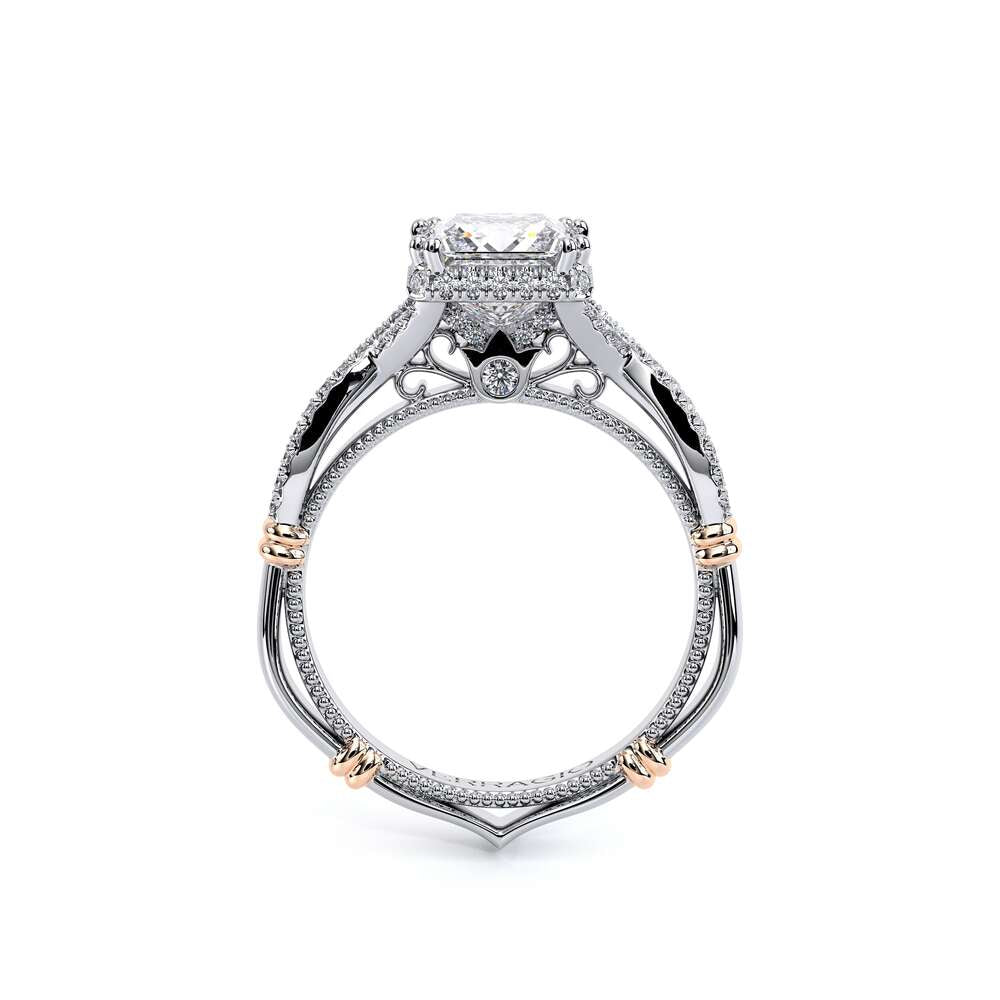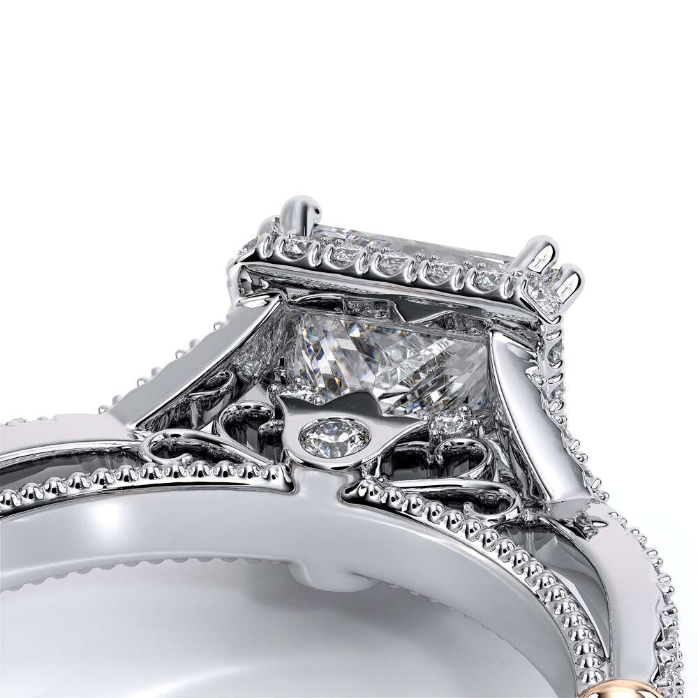 Parisian-105XP is a classic engagement ring that features pave set twisted diamond band showcasing our brand new Stardust princess halo. The details continue to flow with the addition of Parisian Lace, our Verragio signature beading and lastly the rose gold Timeless wraps.
