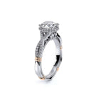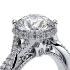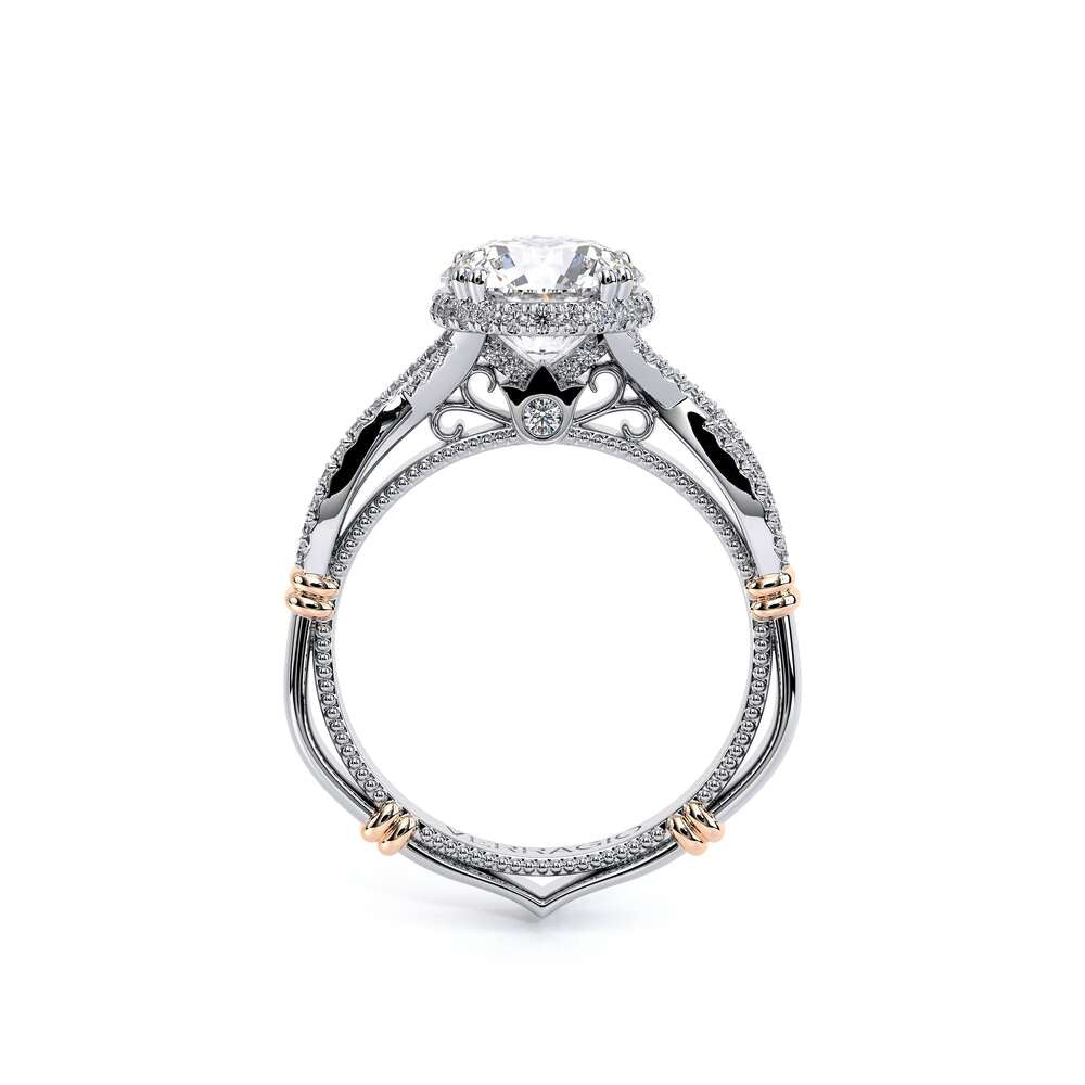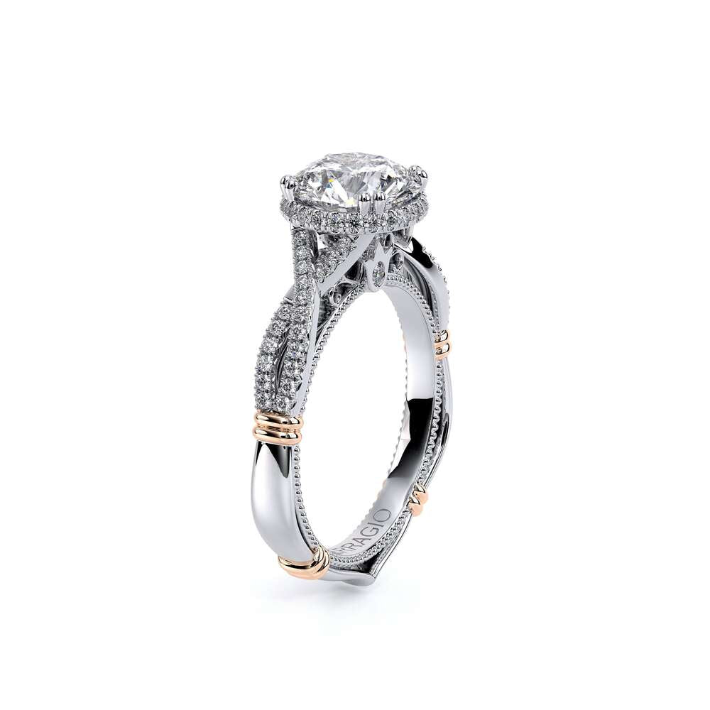 Parisian-105XR is a classic engagement ring that features pave set twisted diamond band showcasing our brand new Stardust round halo. The details continue to flow with the addition of Parisian Lace, our Verragio signature beading and lastly the rose gold Timeless wraps.