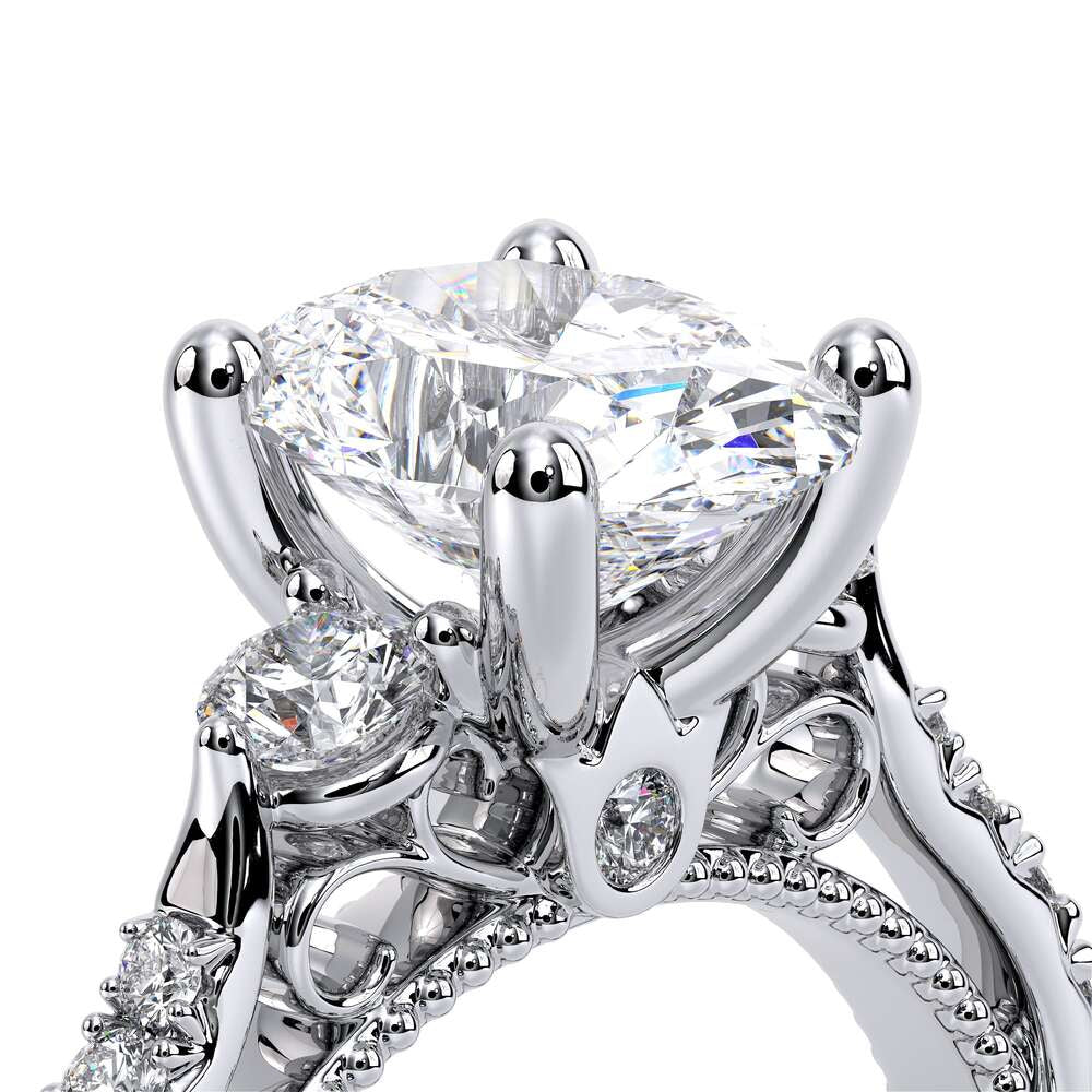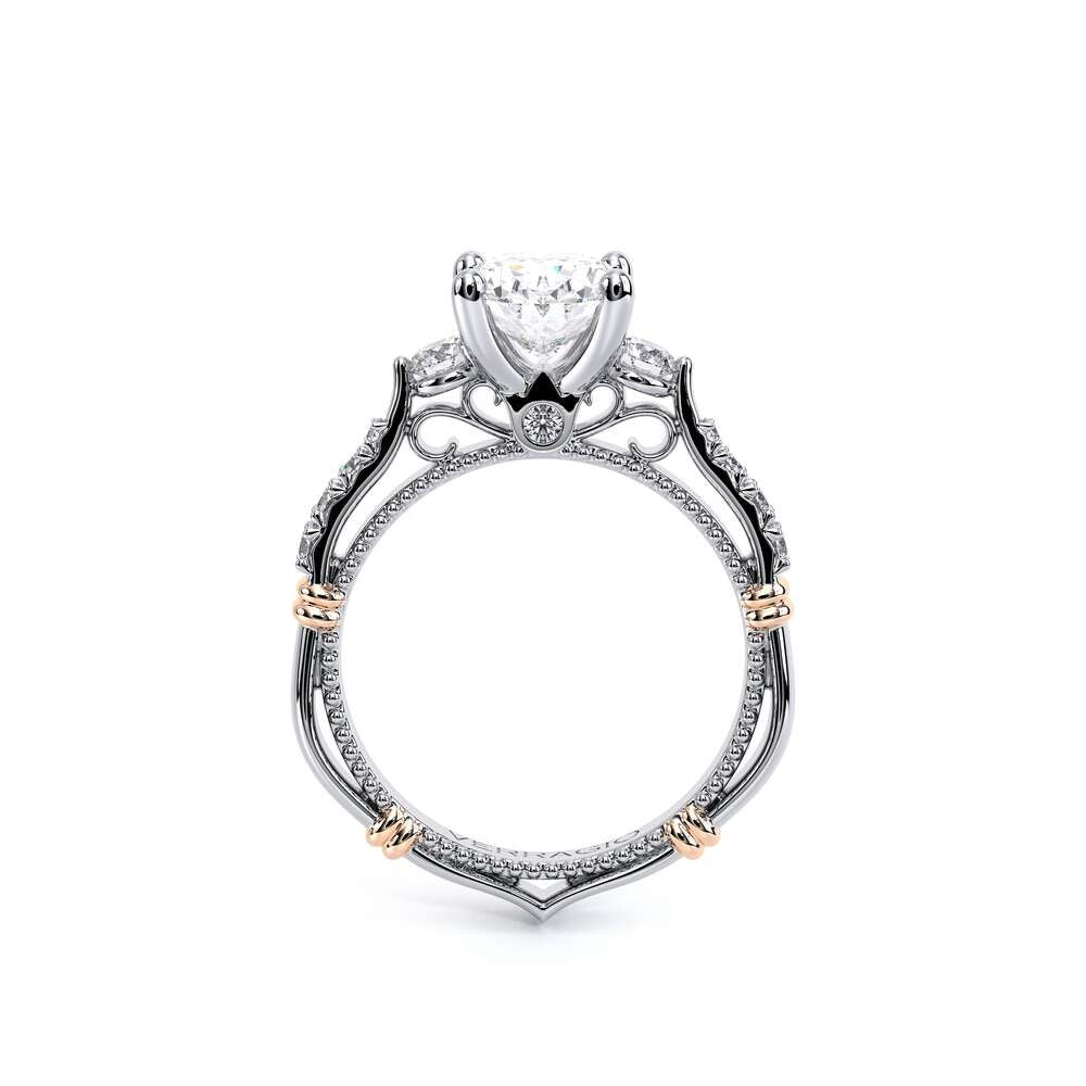 Parisian-124OV is the beautifully designed three-stone engagement ring of your dreams. Featuring the traditional look of the round brilliant side stones, Timeless wraps in rose gold and our elegant Verragio signature beading.