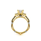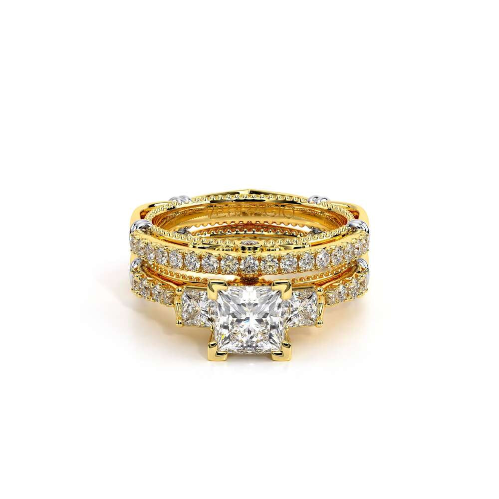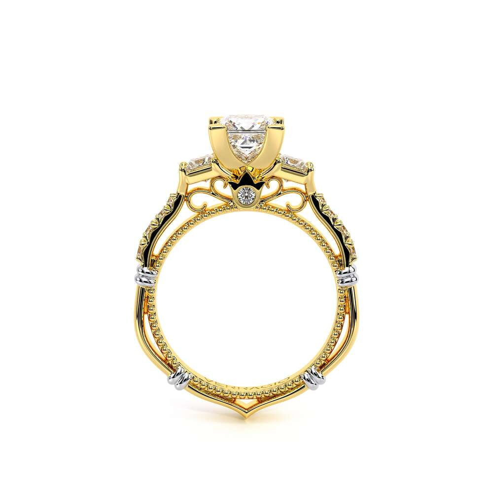 PARISIAN-124P is the beautifully designed three-stone engagement ring of your dreams. Featuring the traditional look of the princess cut side stones, Timeless wraps in rose gold and our elegant Verragio signature beading.