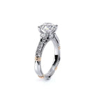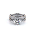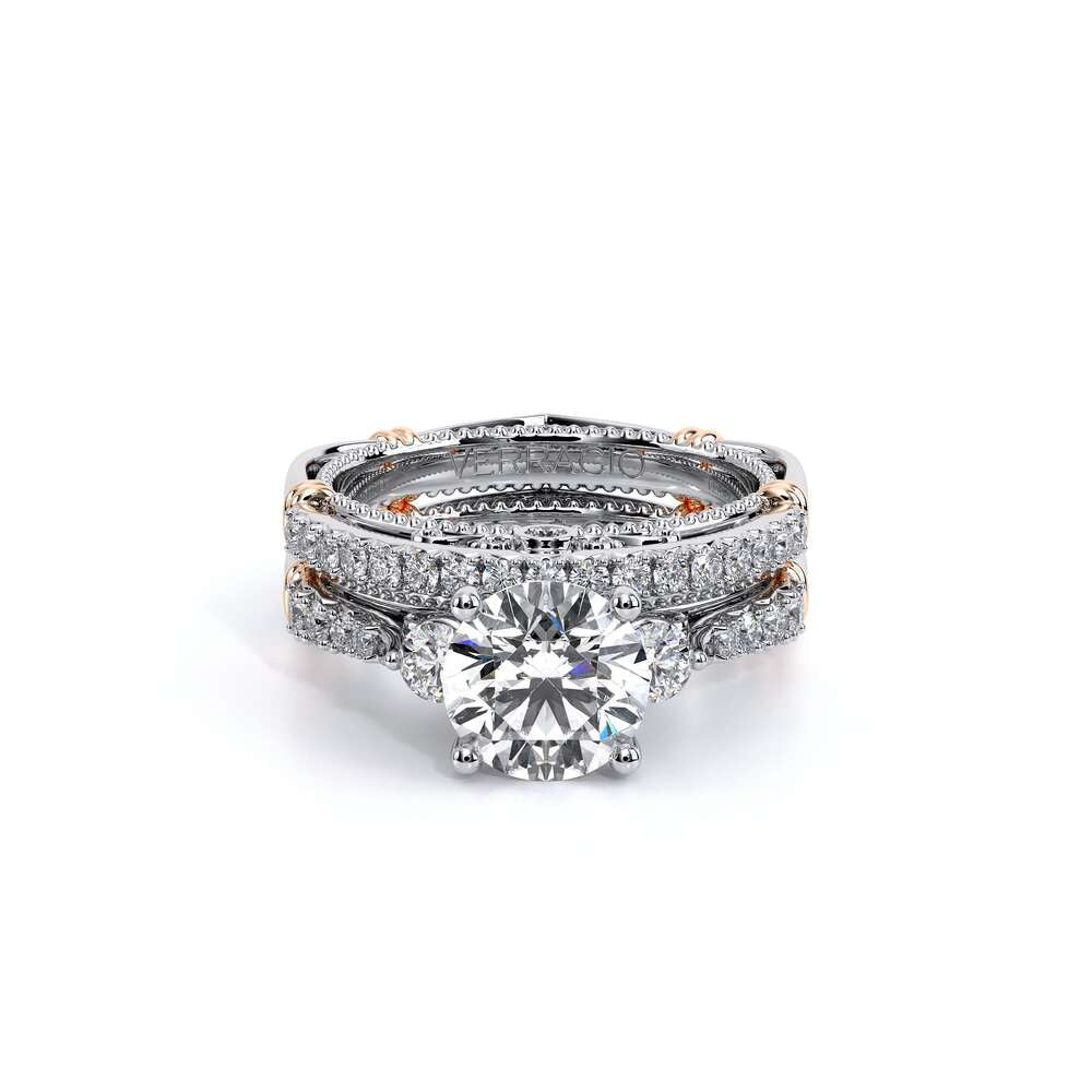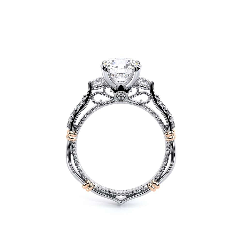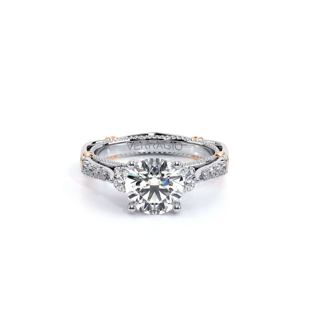 PARISIAN-124R is the beautifully designed three-stone engagement ring of your dreams. Featuring the traditional look of the round brilliant side stones, Timeless wraps in rose gold and our elegant Verragio signature beading.