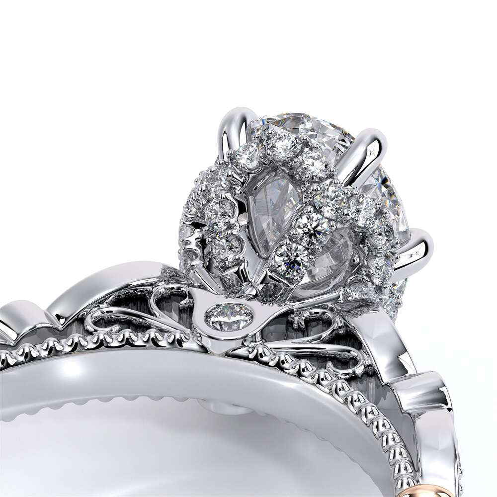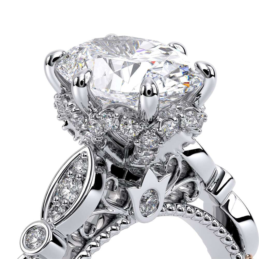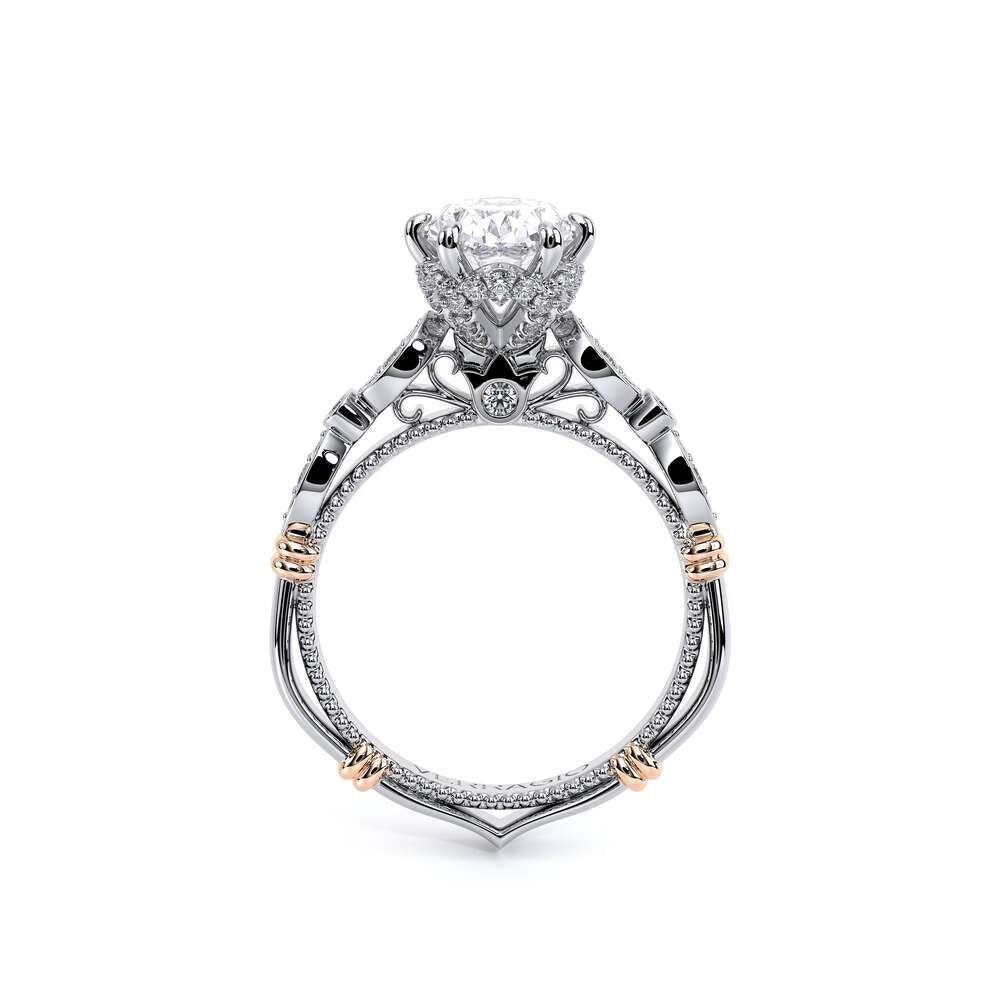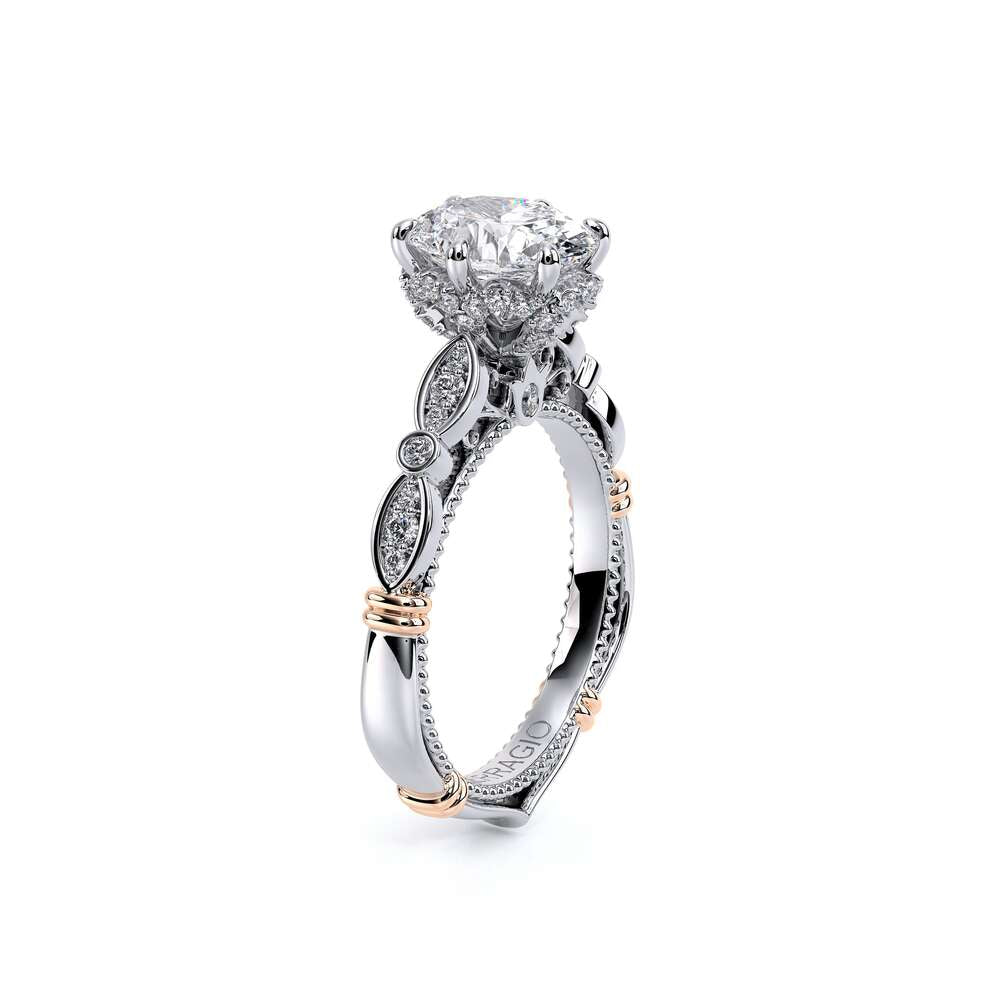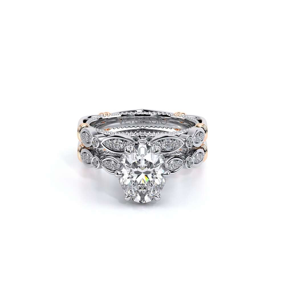 PARISIAN-151R engagement ring carries the vintage scalloped design while adding a beautiful handcrafted diamond tiara to enhance the oval center diamond. Featuring our rose gold Timeless wraps, Parisian Lace and Verragio' s signature beading- this ring is the complete package.