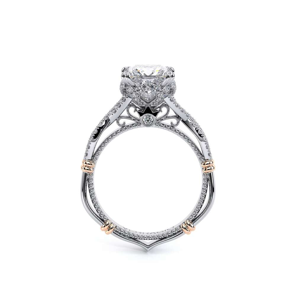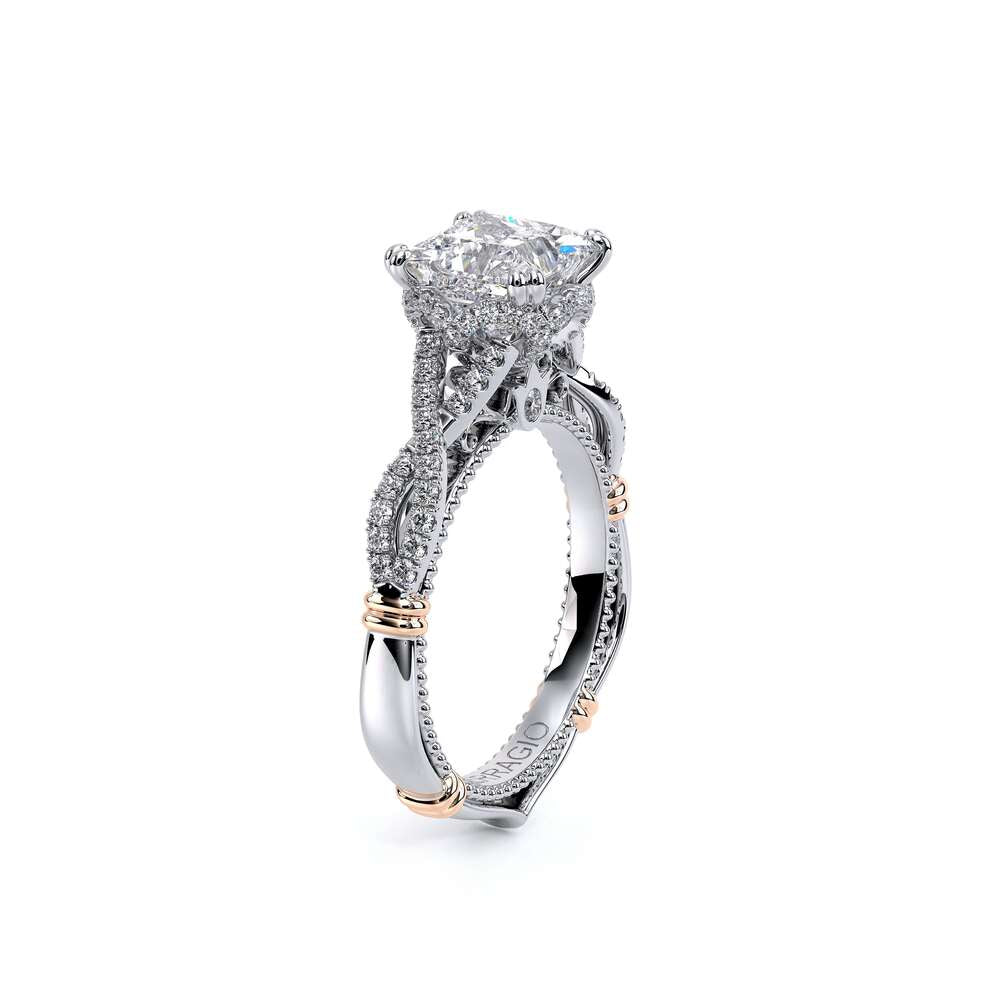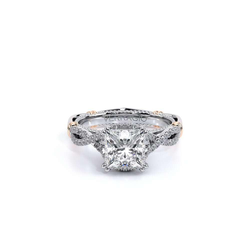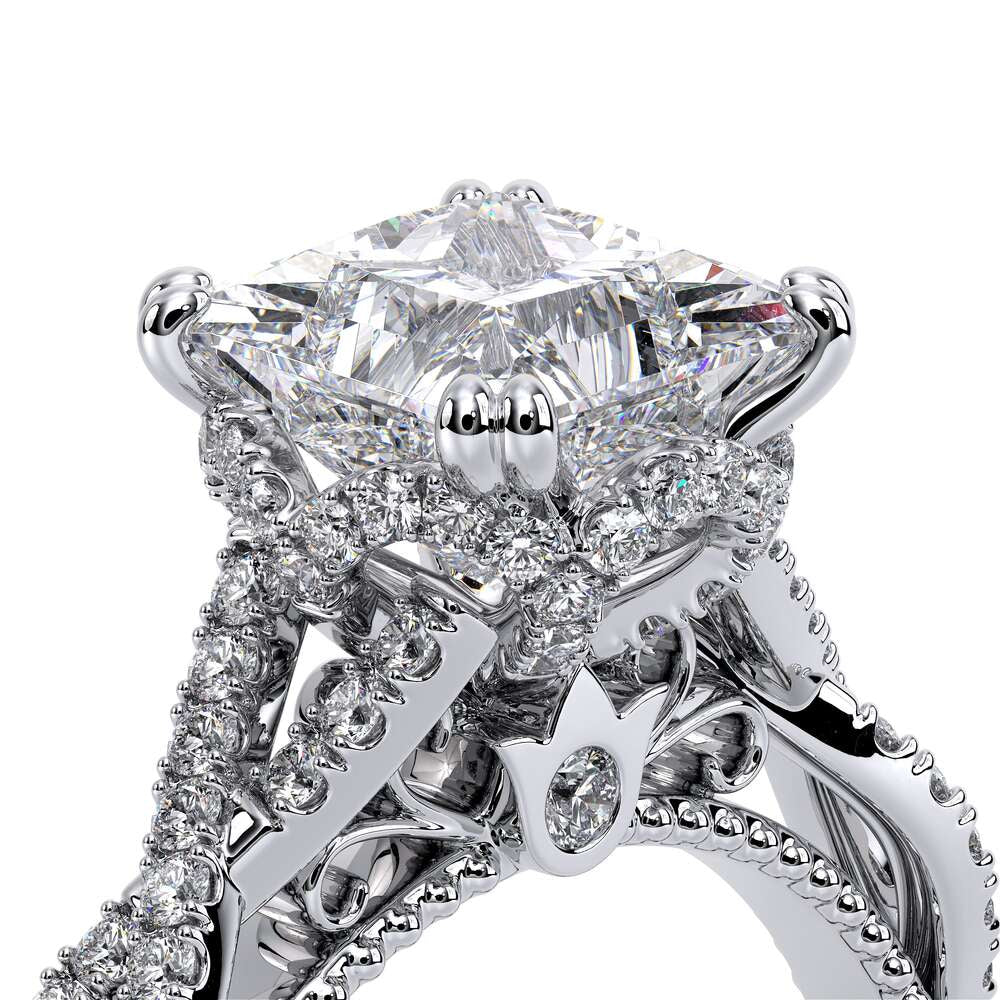 Parisian-153P is a uniquely designed engagement ring that showcases Verragio' s diamond encrusted tiara that enhances a princess diamond center. The details continue through with the addition of the Timeless wraps, Parisian lace and Verragio signature beading.