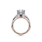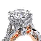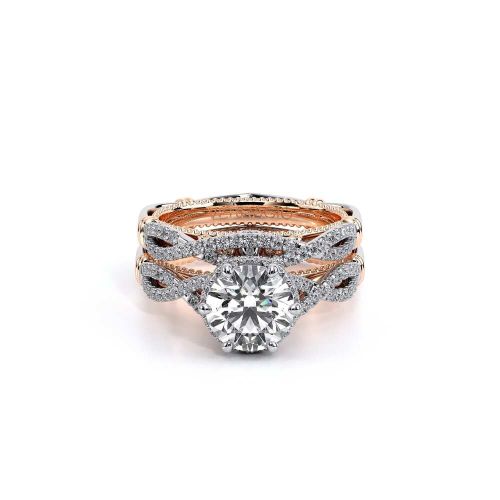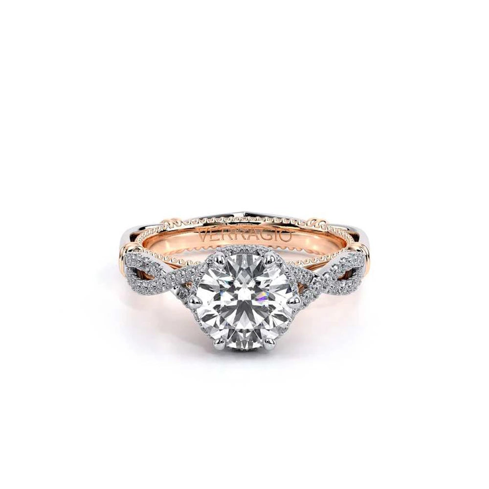Parisian-153R is a uniquely designed engagement ring that showcases Verragio's diamond encrusted tiara that enhances a round diamond center. The details continue through with the addition of the Timeless wraps, Parisian lace and Verragio signature beading.