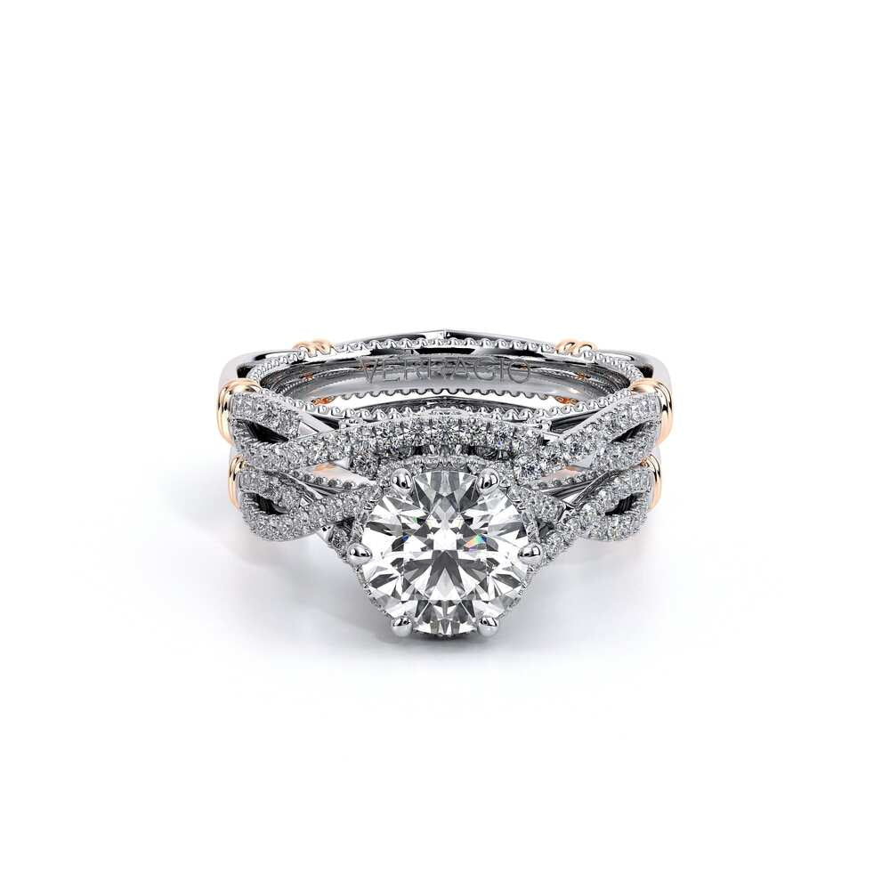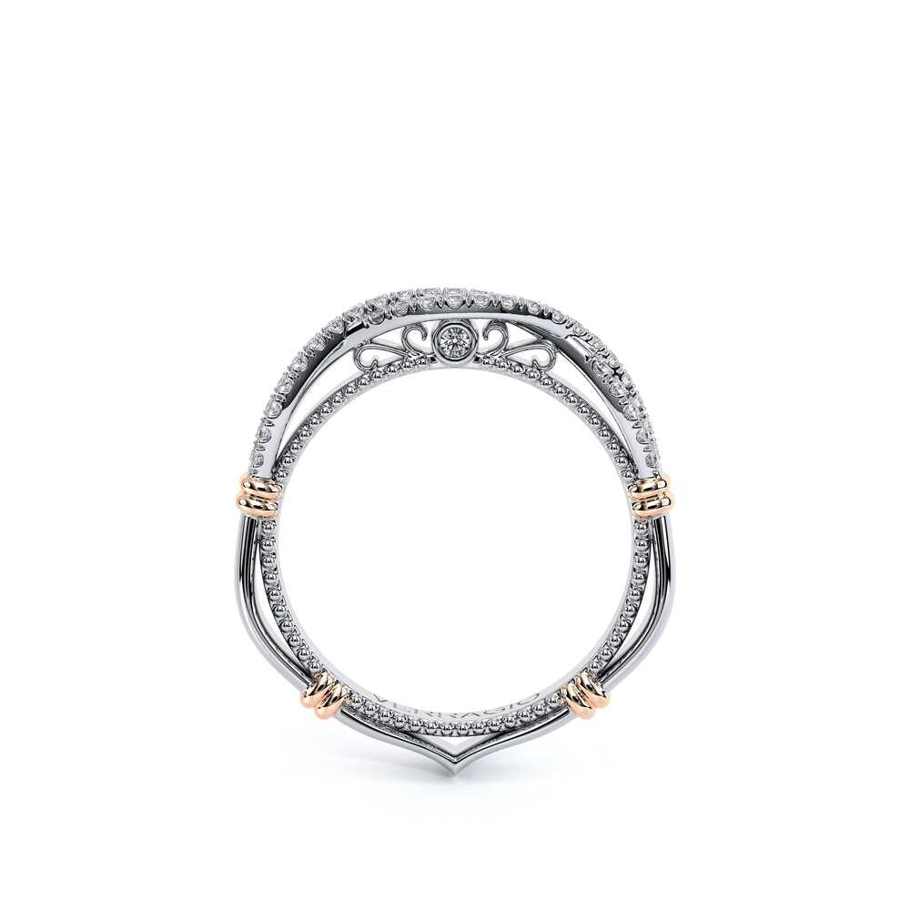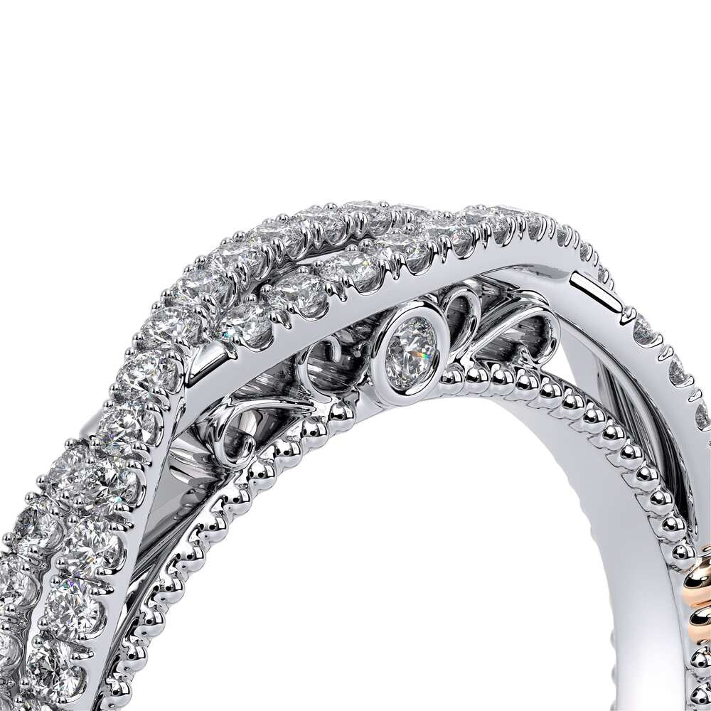 Parisian-153W wedding band is a beautifully handcrafted twisted style band that features the Parisian lace detail, our Verragio Signature beading and rose gold Timeless wraps that is meant to compliment your Parisian engagement ring. **Note: +$400 for Lace, Beading or Both in a different color