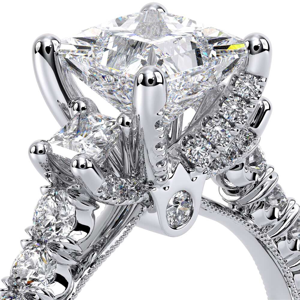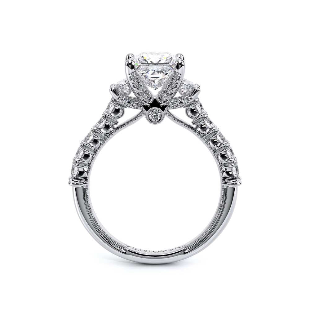 Renaissance-958P2.7 adds additional sparkle to a classic engagement ring. Pave set diamond prongs enhance this elegant three stone engagement ring.