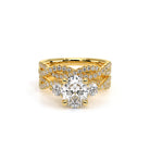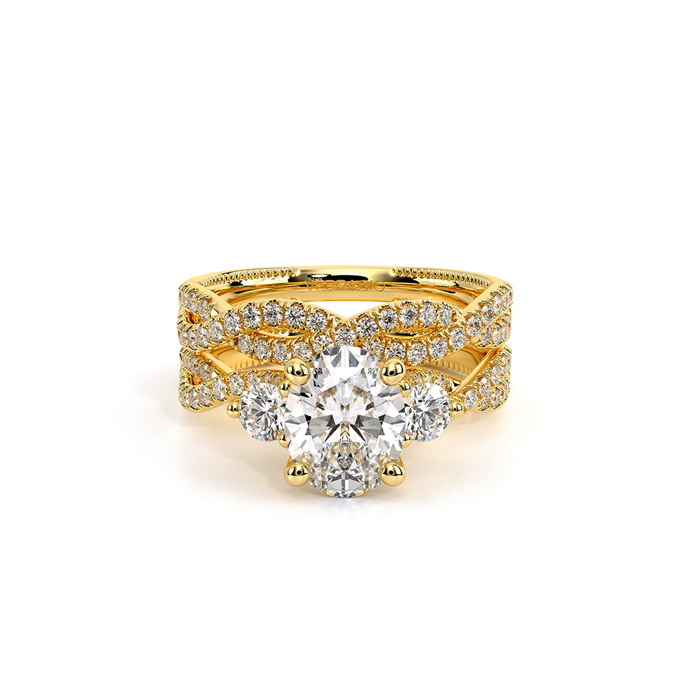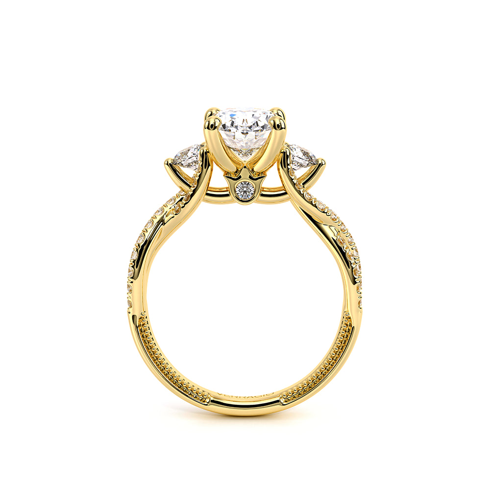 Renaissance-962-3OV1.2 features three dazzling stones representing past, present, and future. The twisted shank adds modern elegance with its delicate diamonds. Milgrain detailing and the signature Verragio crest make this ring a symbol of timeless love and commitment.