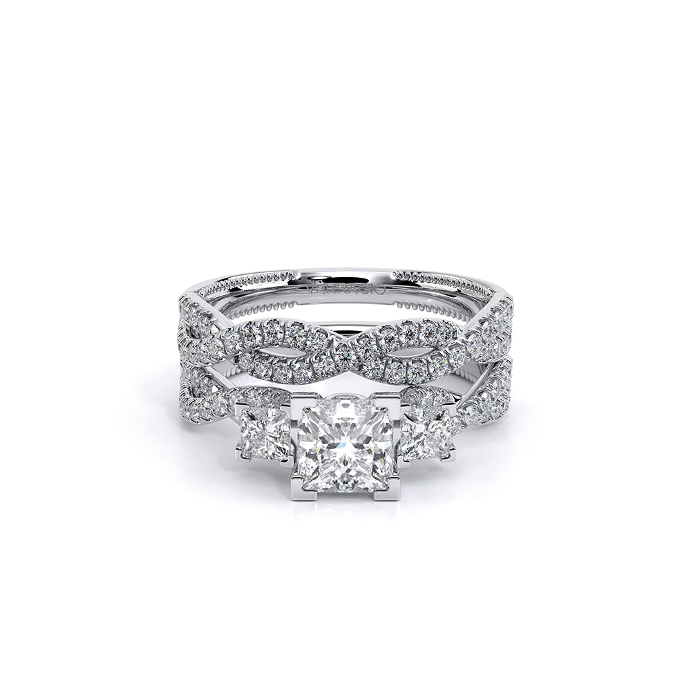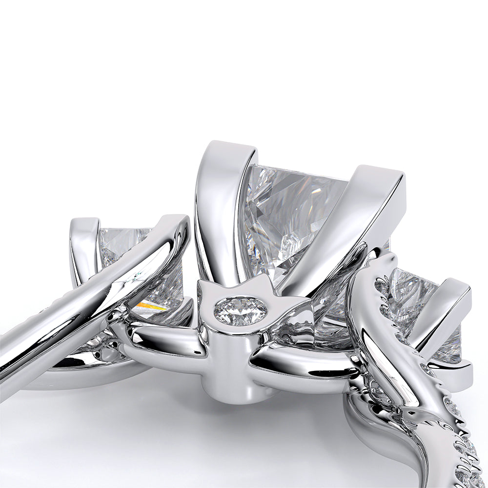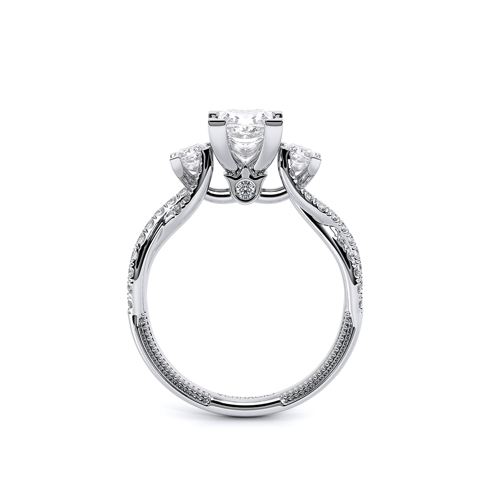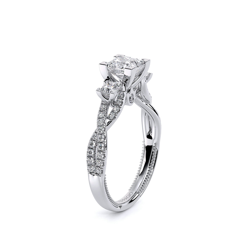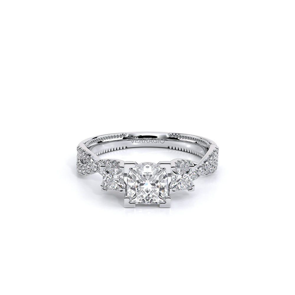 Renaissance-962-3P1.2 features three dazzling stones representing past, present, and future. The twisted shank adds modern elegance with its delicate diamonds. Milgrain detailing and the signature Verragio crest make this ring a symbol of timeless love and commitment.