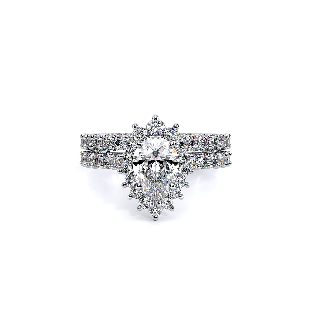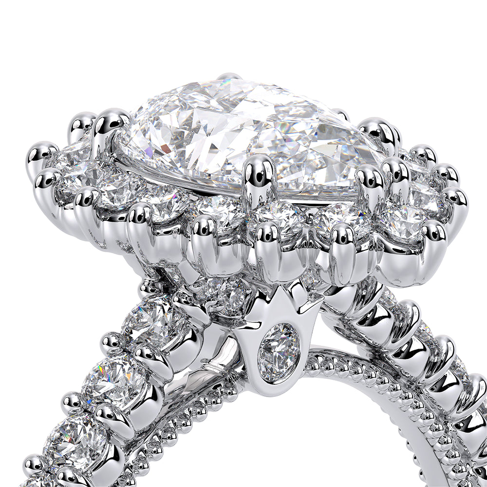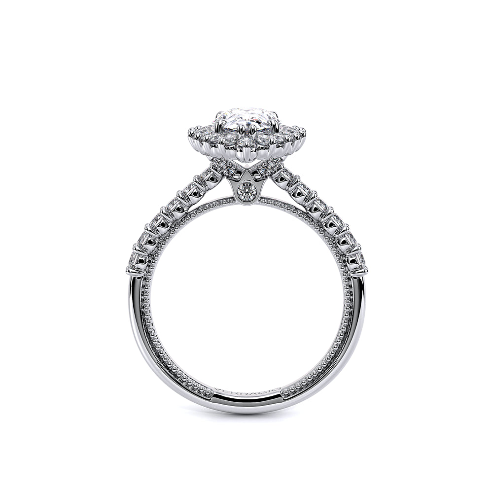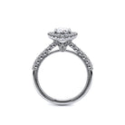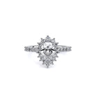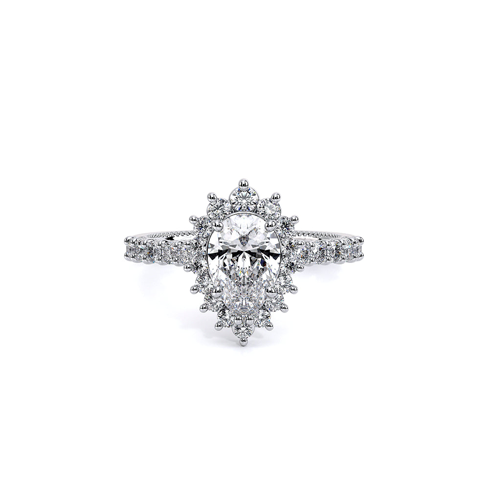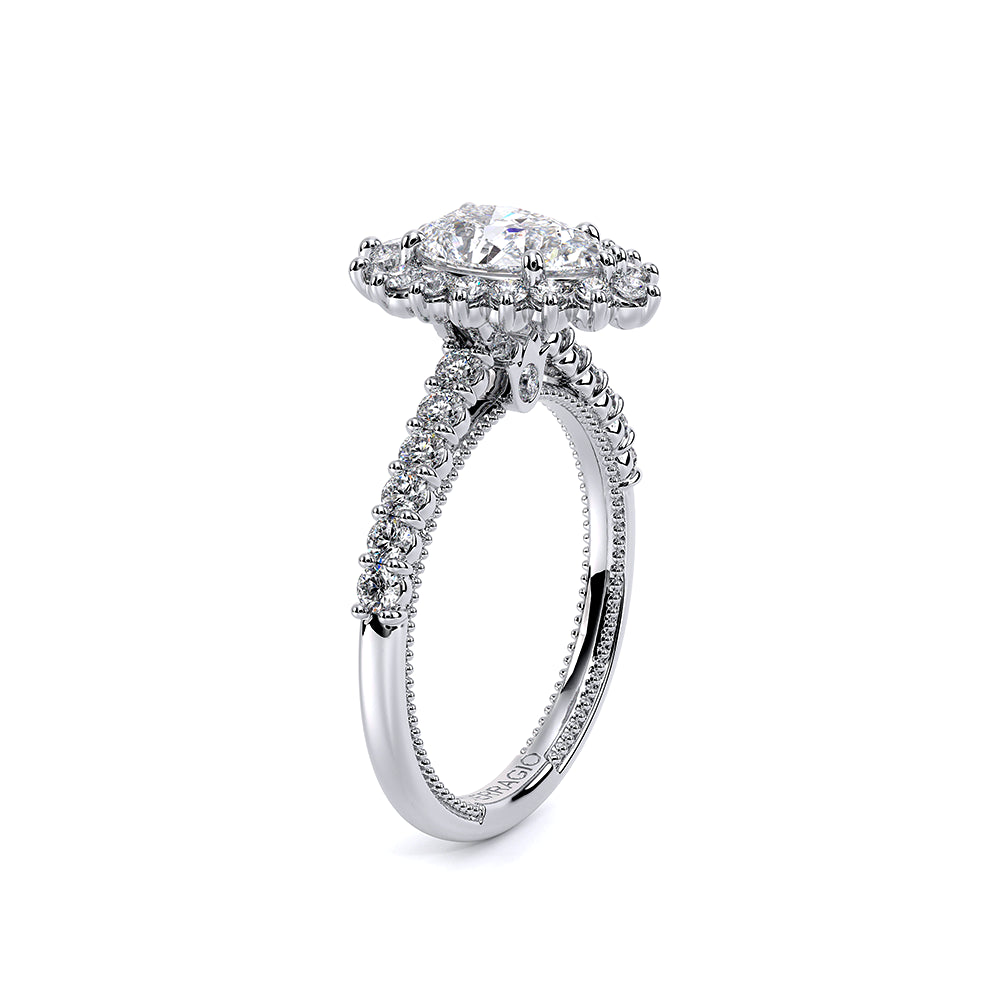 Renaissance-986PS engagement ring features Verragio' s handcrafted Crown halo. Meticulous prong-set round brilliant-cut diamonds sit atop a straight band refined by Verragio' s timeless signature crest and milgrain.