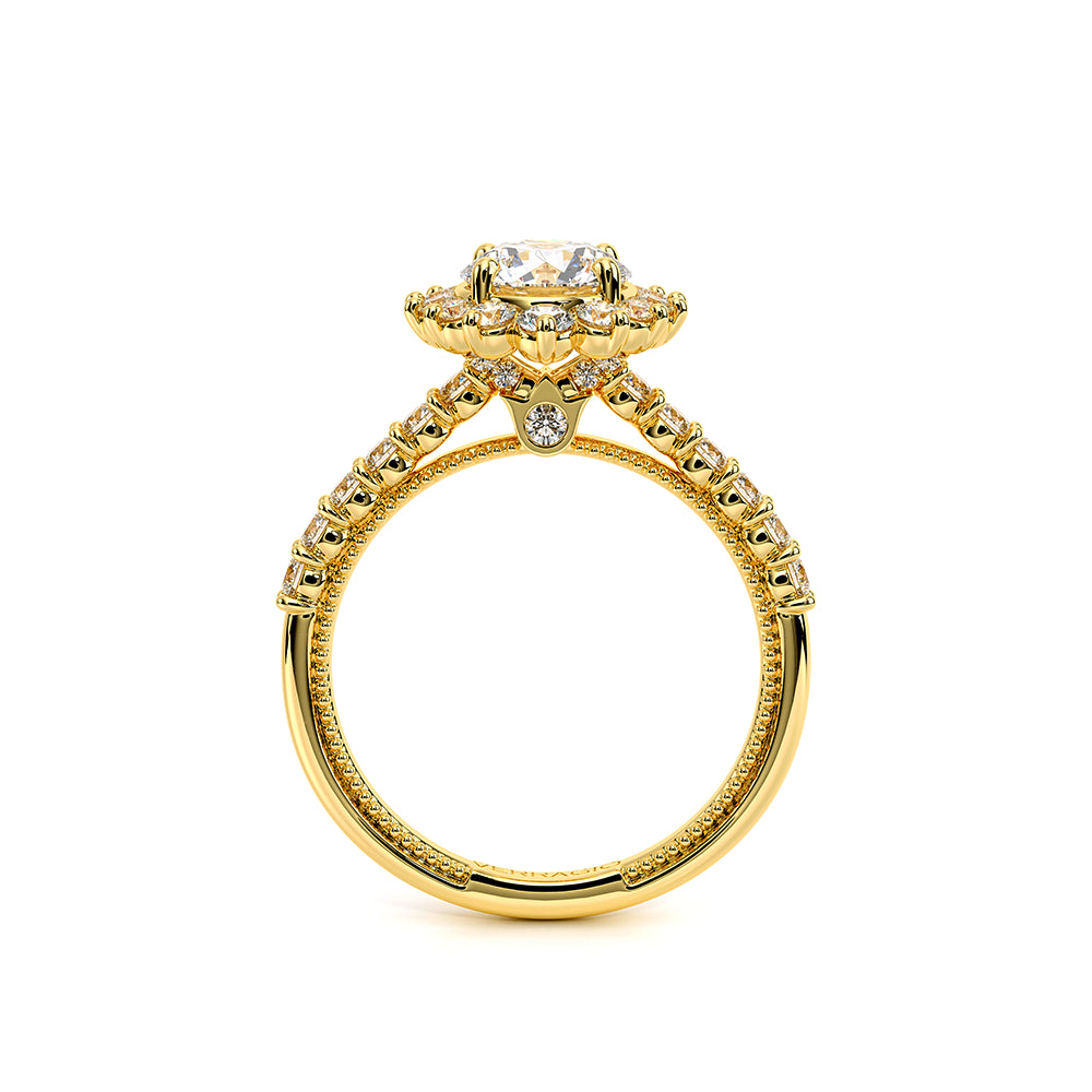 Renaissance-986R engagement ring features Verragio' s handcrafted Crown halo. Meticulous prong-set round brilliant-cut diamonds sit atop a straight band refined by Verragio' s timeless signature crest and milgrain.