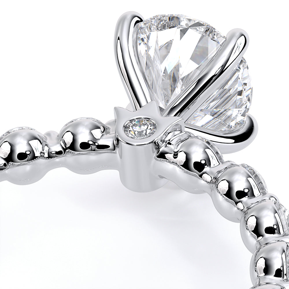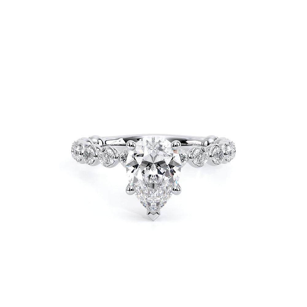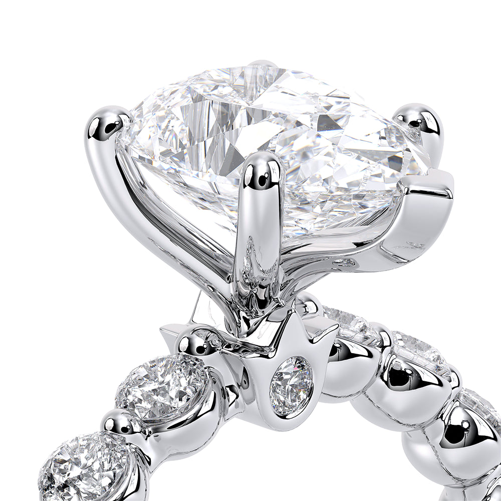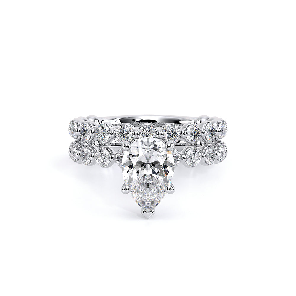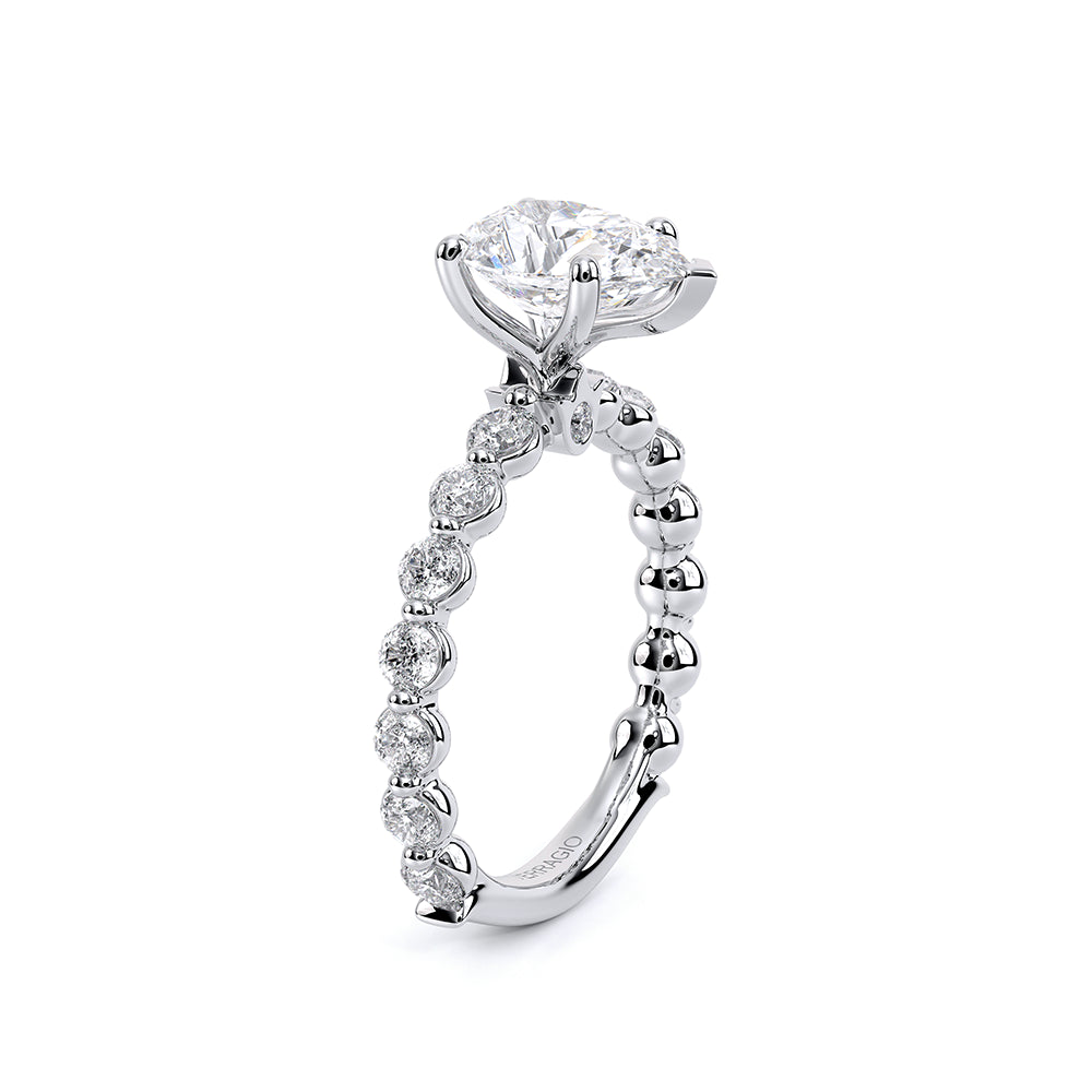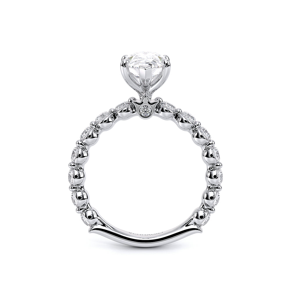 Renaissance-989PS-2.5 features a diamond-rich, four-prong setting meticulously crafted to cradle each stone securely. Its sleek, shared-prong cup setting exudes elegance, while the design ensures both comfort and durability. Verragio's signature crest unifies the sophisticated style.