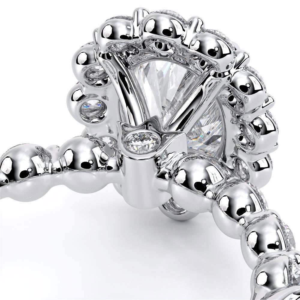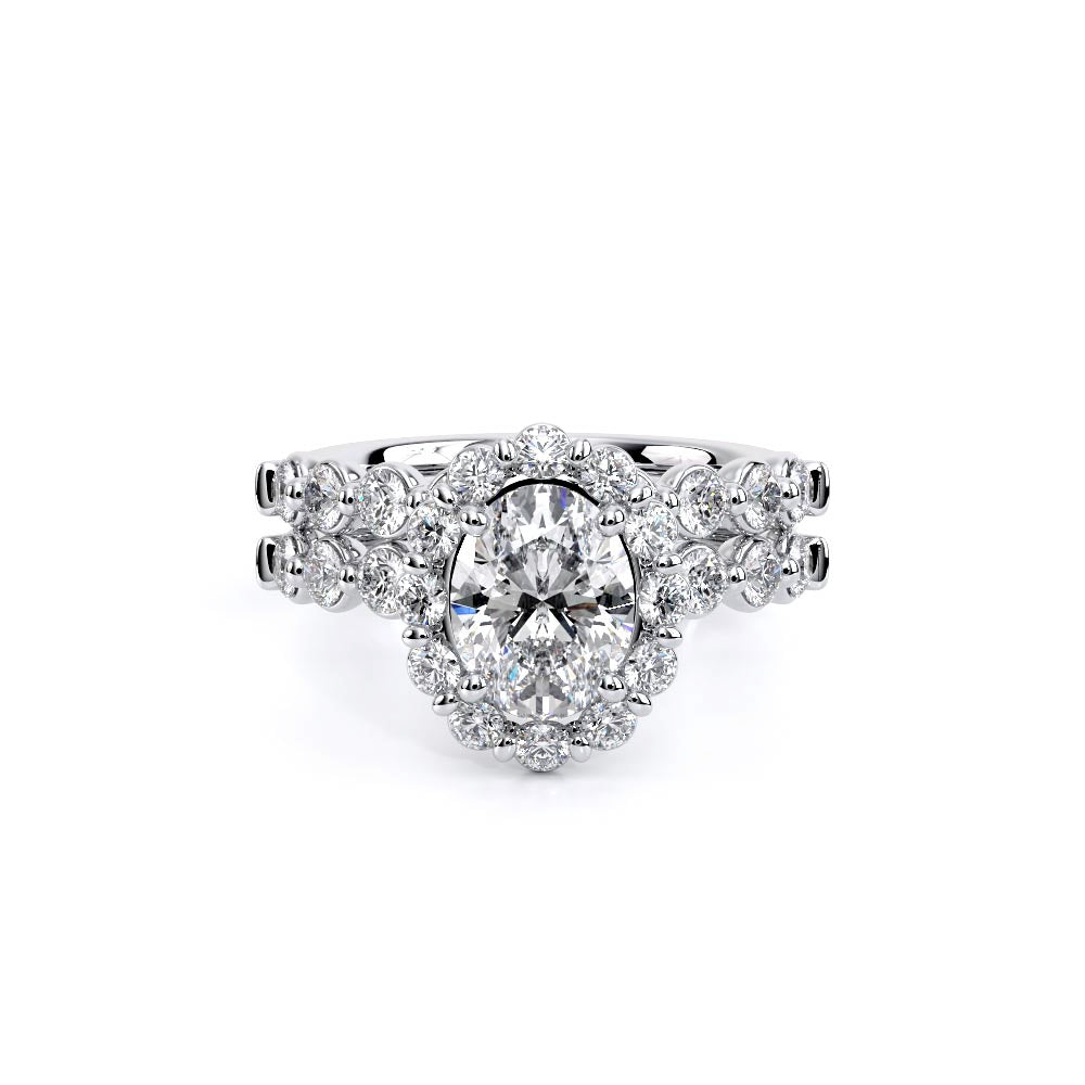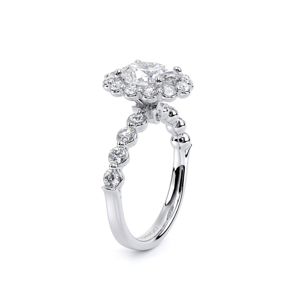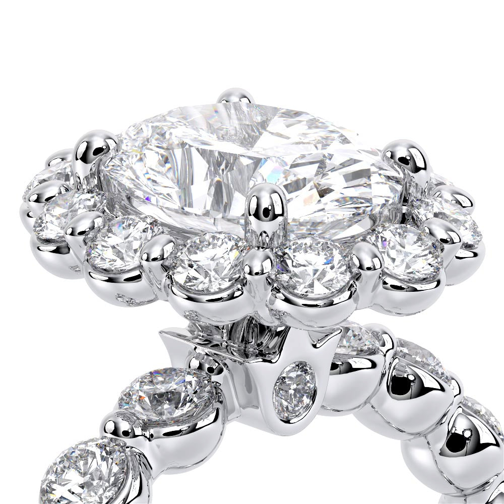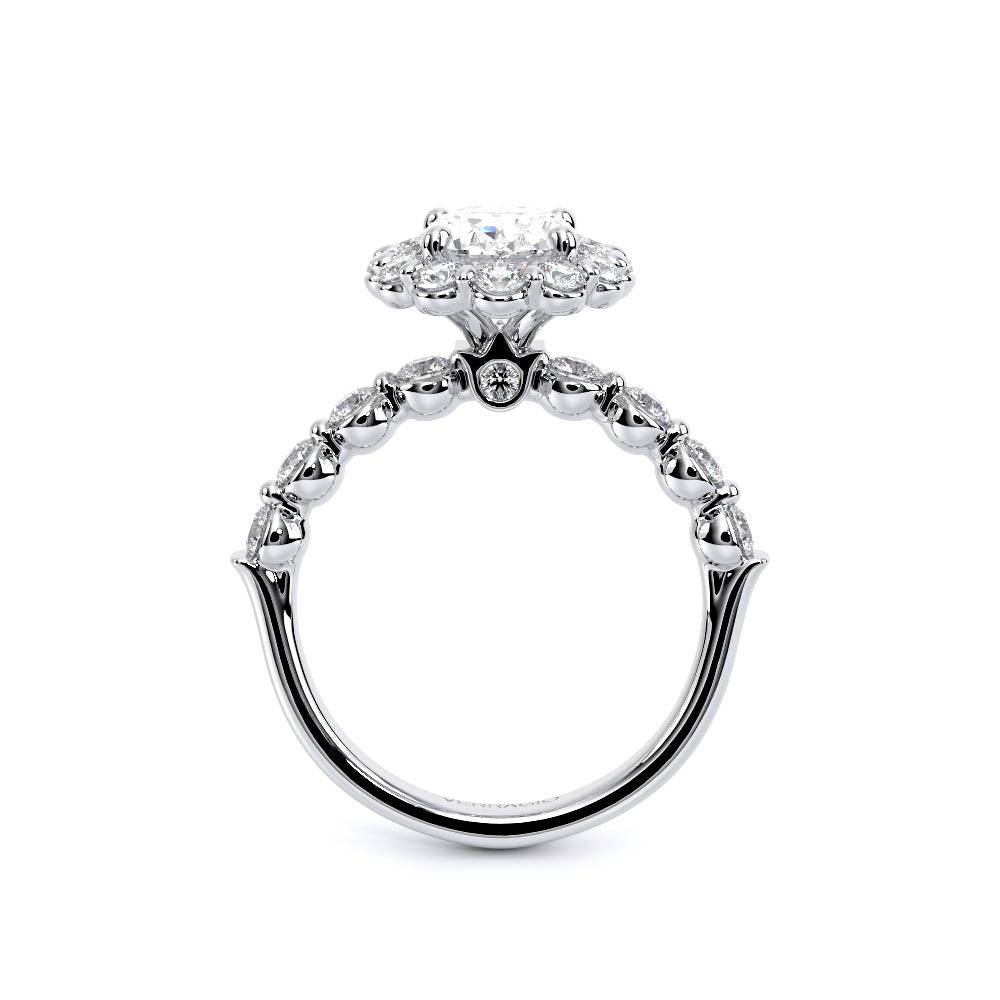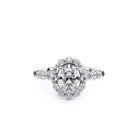 Renaissance-990OV-2.5 features a diamond-rich, halo setting meticulously crafted to cradle each stone securely. Its sleek, shared-prong cup setting exudes elegance, while the design ensures both comfort and durability. Verragio's signature crest unifies this classic yet modern style.